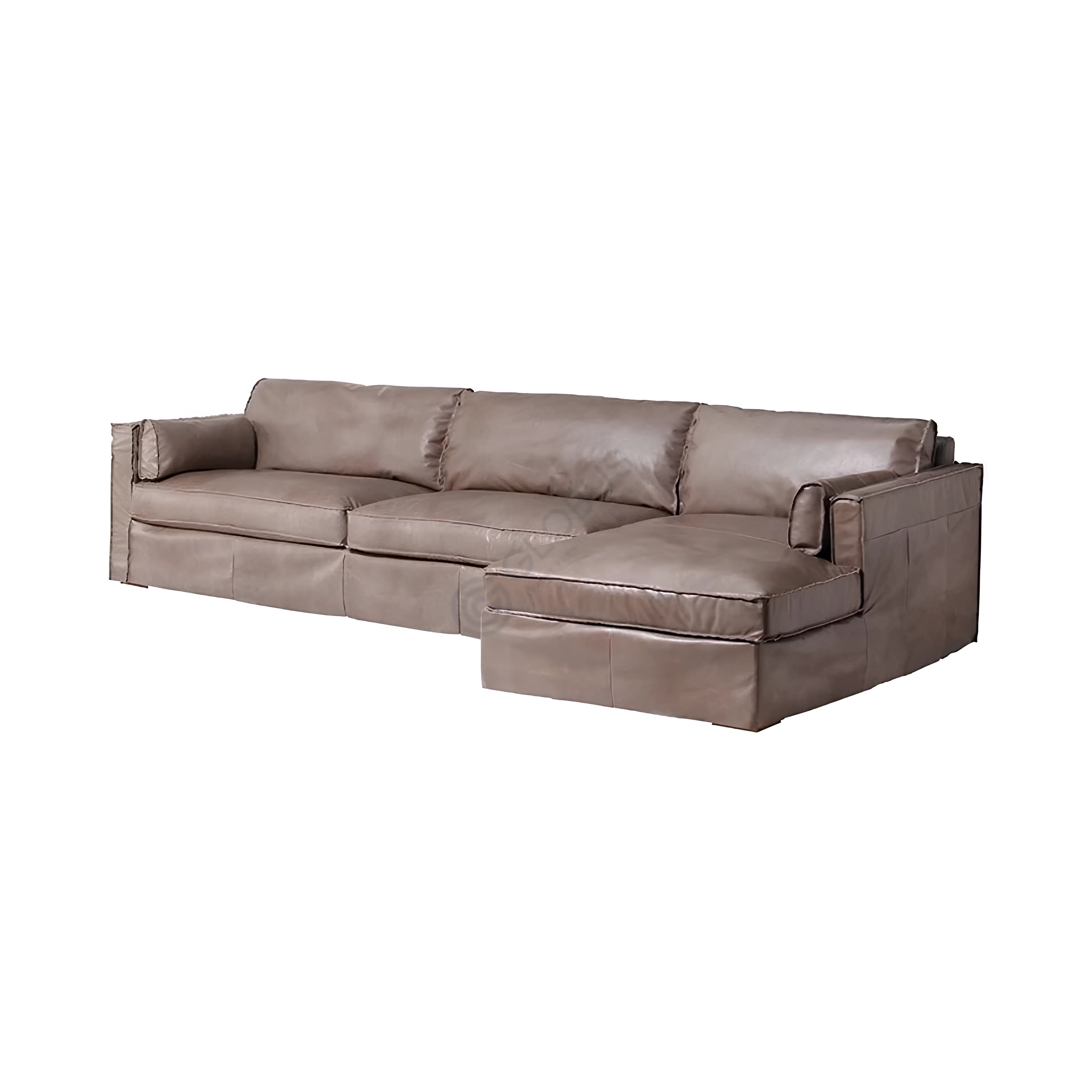 Built on a solid wood and plywood frame, it offers a stable, long-lasting foundation with a supportive yet relaxed sit. A neatly paneled leather skirt streamlines the base and keeps the profile visually light while concealing the underframe.
