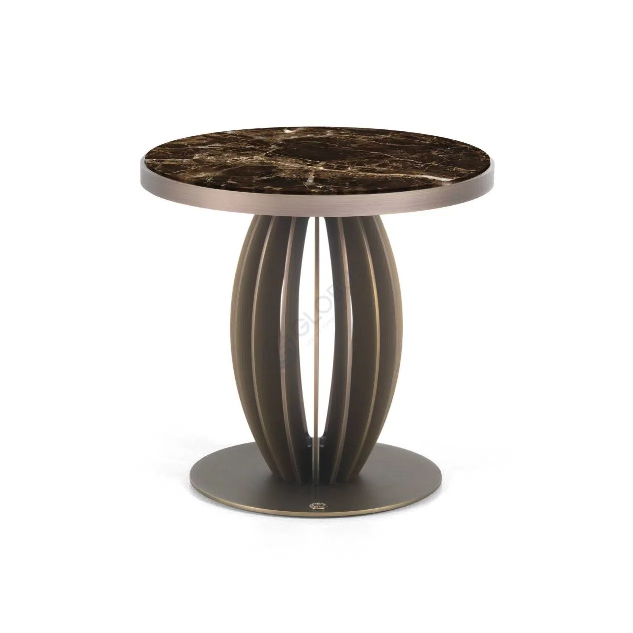 A round tempered glass top rests on a polished copper frame, its clear surface floating above a sculptural column of curved metal slats. The streamlined silhouette blends modern minimalism with Art Deco symmetry, offering both visual lightness and geometric rhythm.