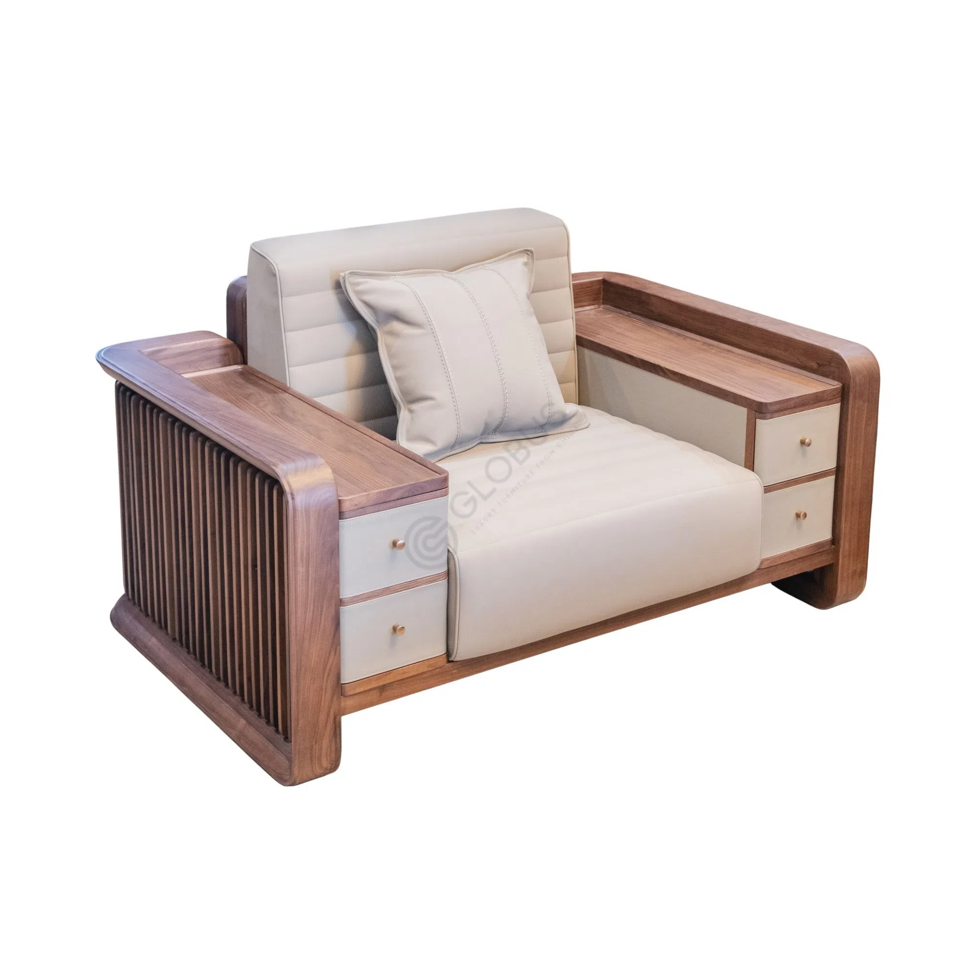 Functional details elevate the piece: each arm integrates a compact console with drawers for remotes, chargers, and journals, topped with a handy surface for tea or a reading lamp. Discreet knobs and the airy rhythm of the side slats keep the look light, while recessed feet give a refined floating effect.
