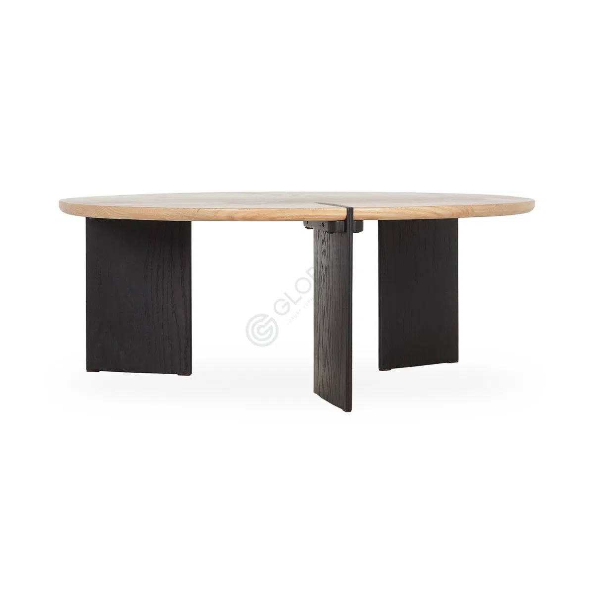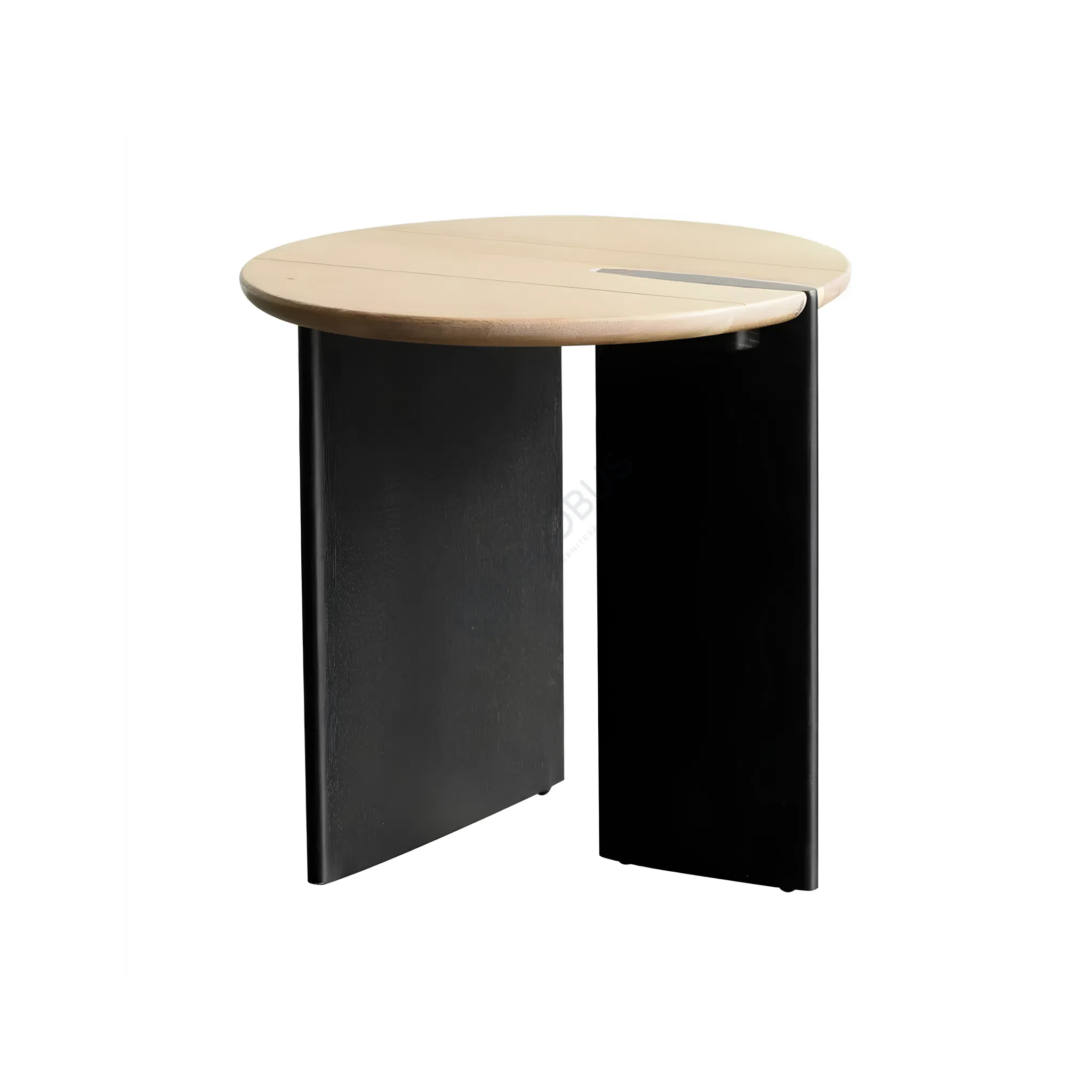 It features a robust tabletop expertly constructed from plywood and natural veneer, showcasing the authentic grain and character of the wood. This substantial surface is supported by two wide, minimalist legs made from solid wood, ensuring enduring stability and a grounded aesthetic. The thoughtful combination of materials speaks to both durability and refined style.