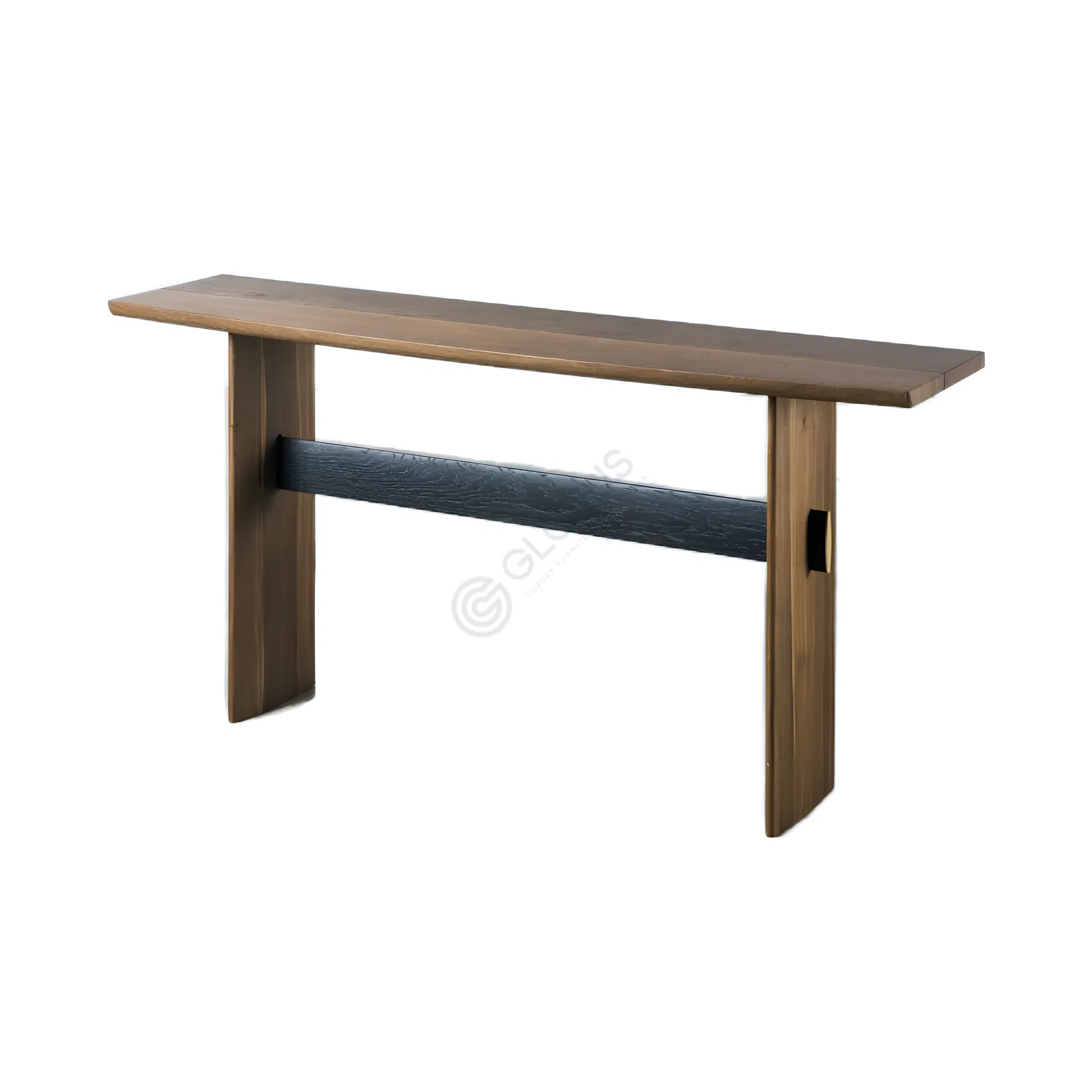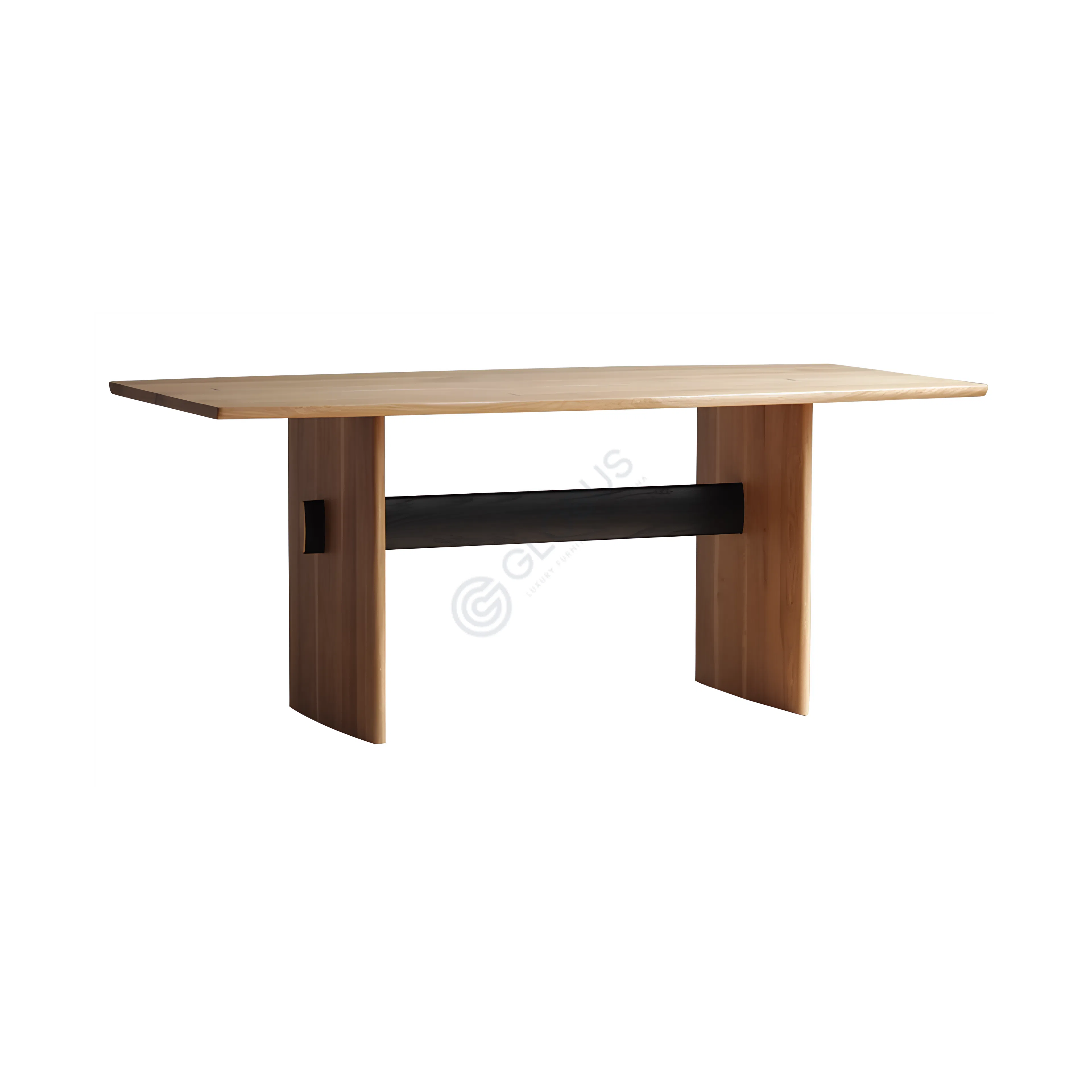 A sleek, dark support bar elegantly bridges the two legs, providing a strong visual line and enhancing the table's structural integrity. This contrasting element introduces a sophisticated touch. Further refining its modern appeal is a subtle metallic accent, a discrete detail that catches the light and adds a whisper of contemporary luxury to the design.