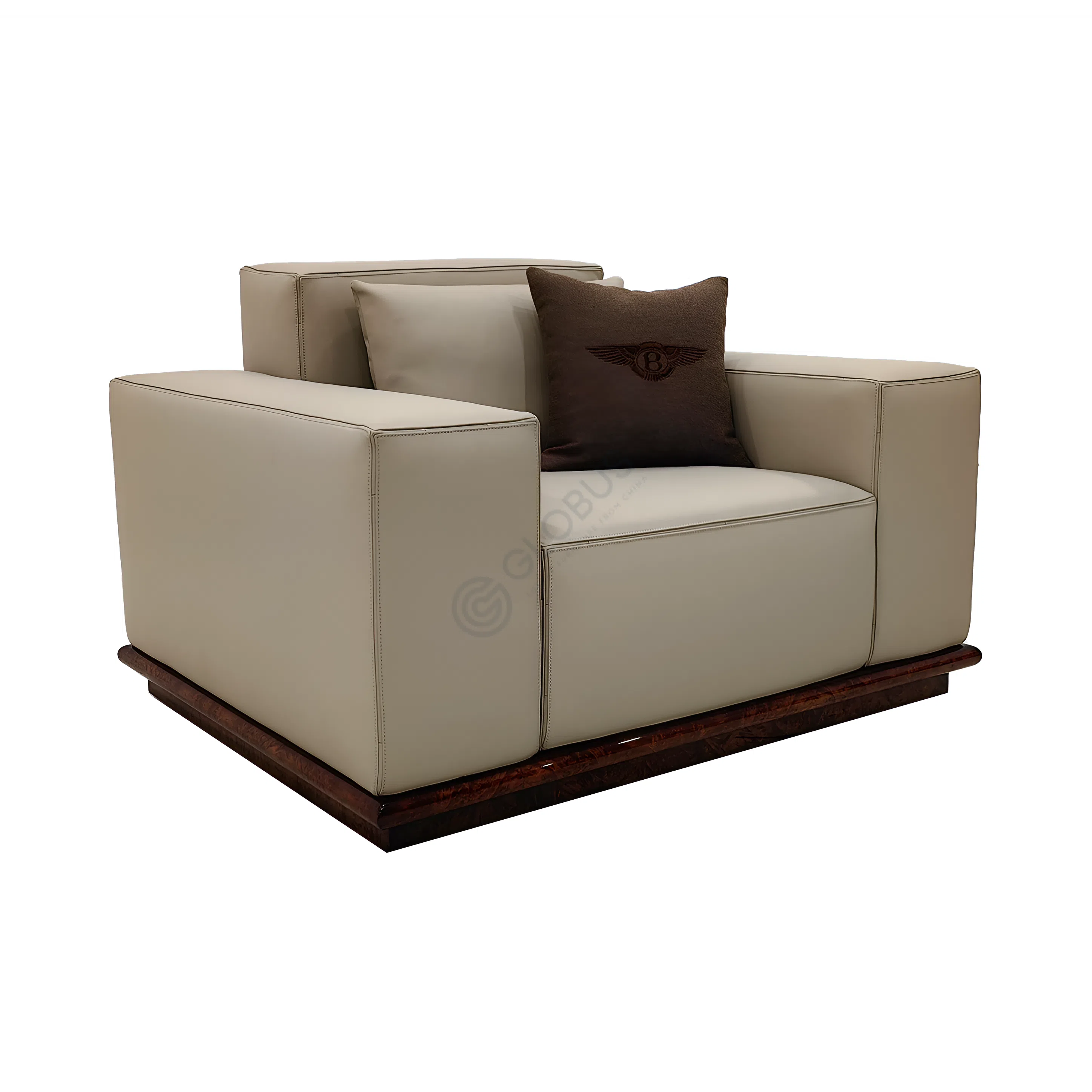 The sofa rests upon an exquisitely detailed base, showcasing the natural beauty of a dark, intricately patterned wood. This distinct foundation elevates the entire piece, providing a striking contrast to the lighter upholstery and ensuring the sofa serves as a commanding yet elegant focal point within any modern interior.