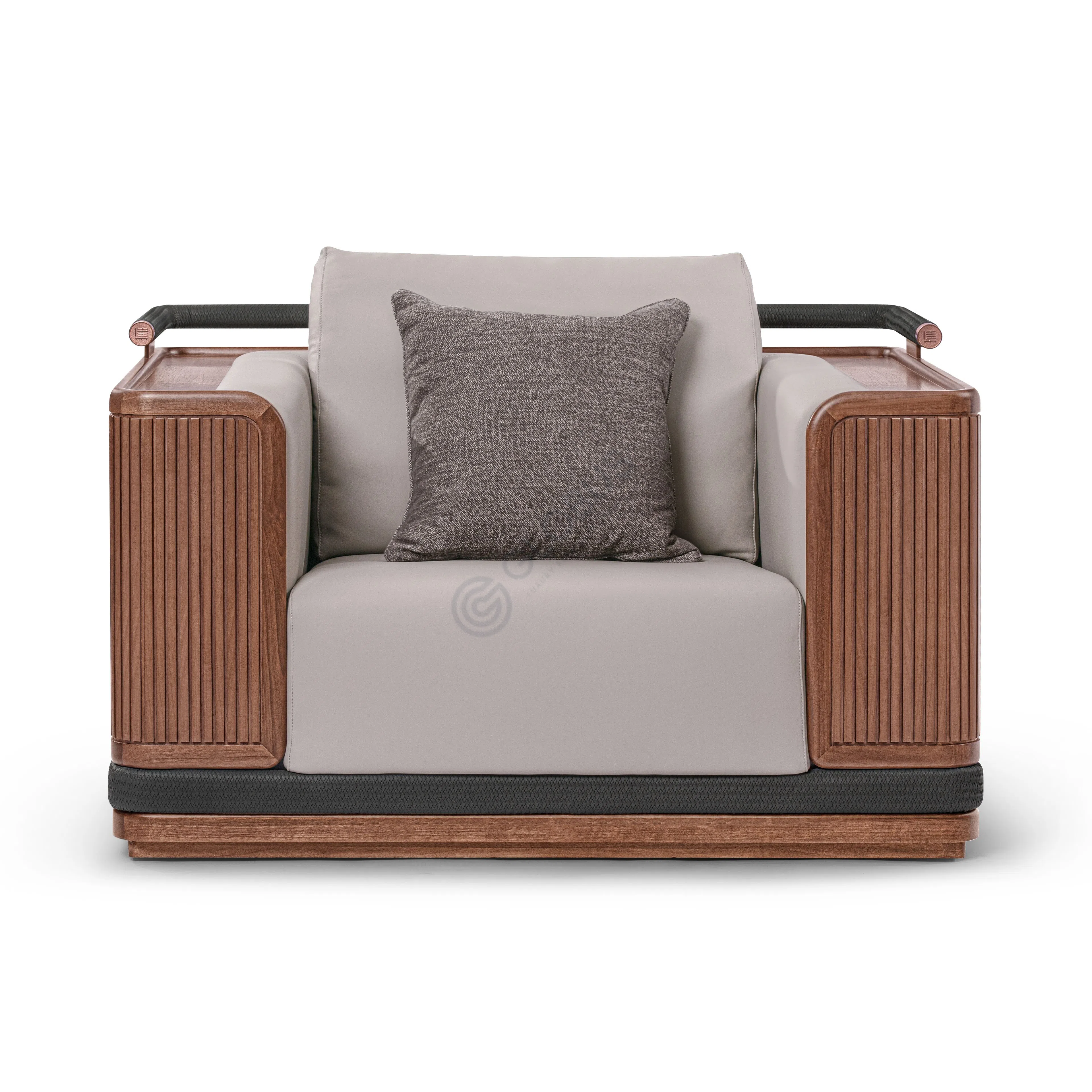 The seating offers generous depth and stable support for relaxed lounging, with high arms that feel secure without overwhelming the room. Its understated colors and tactile mix of wood and leather make it an easy match for stone, linen, or matte metal accents.