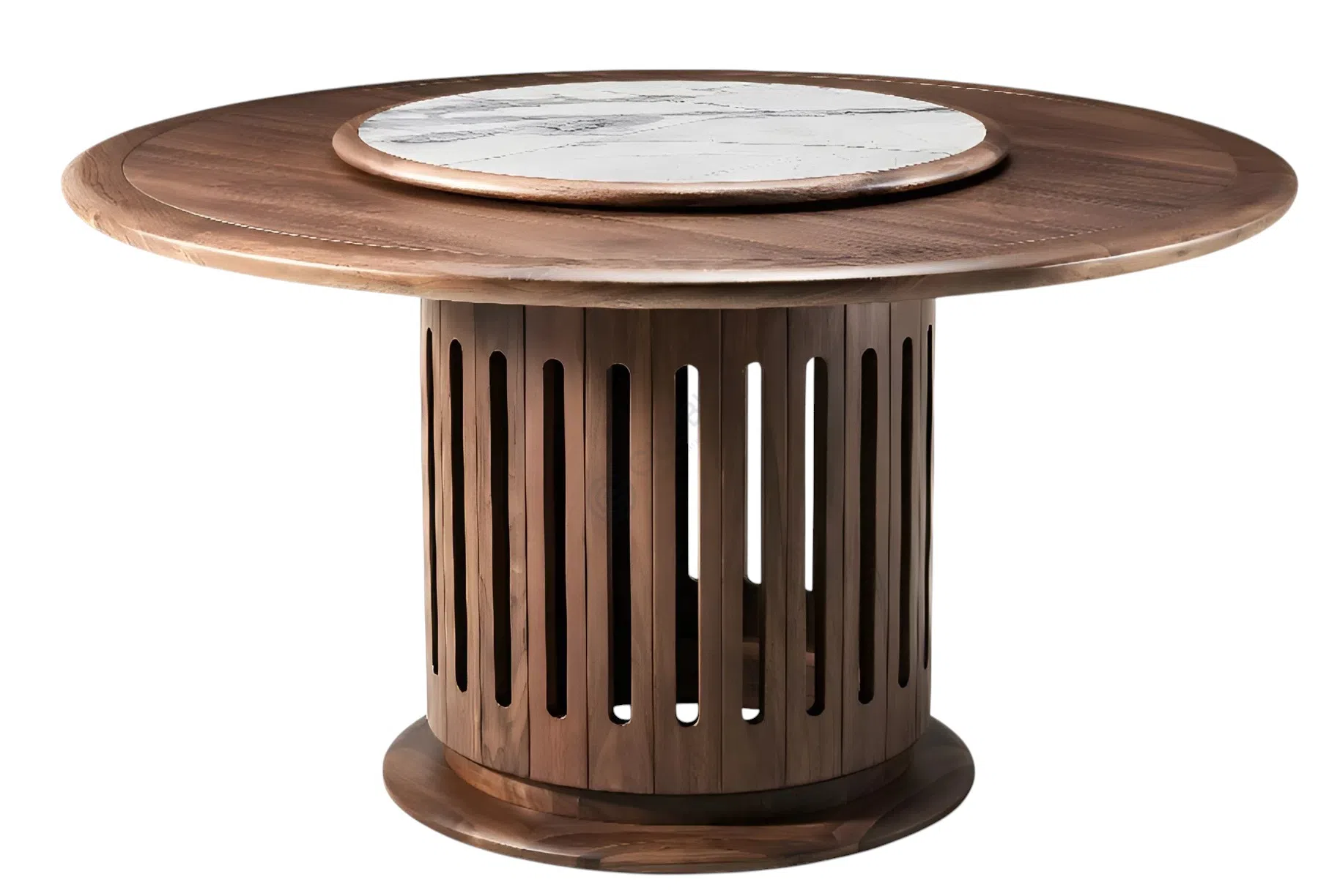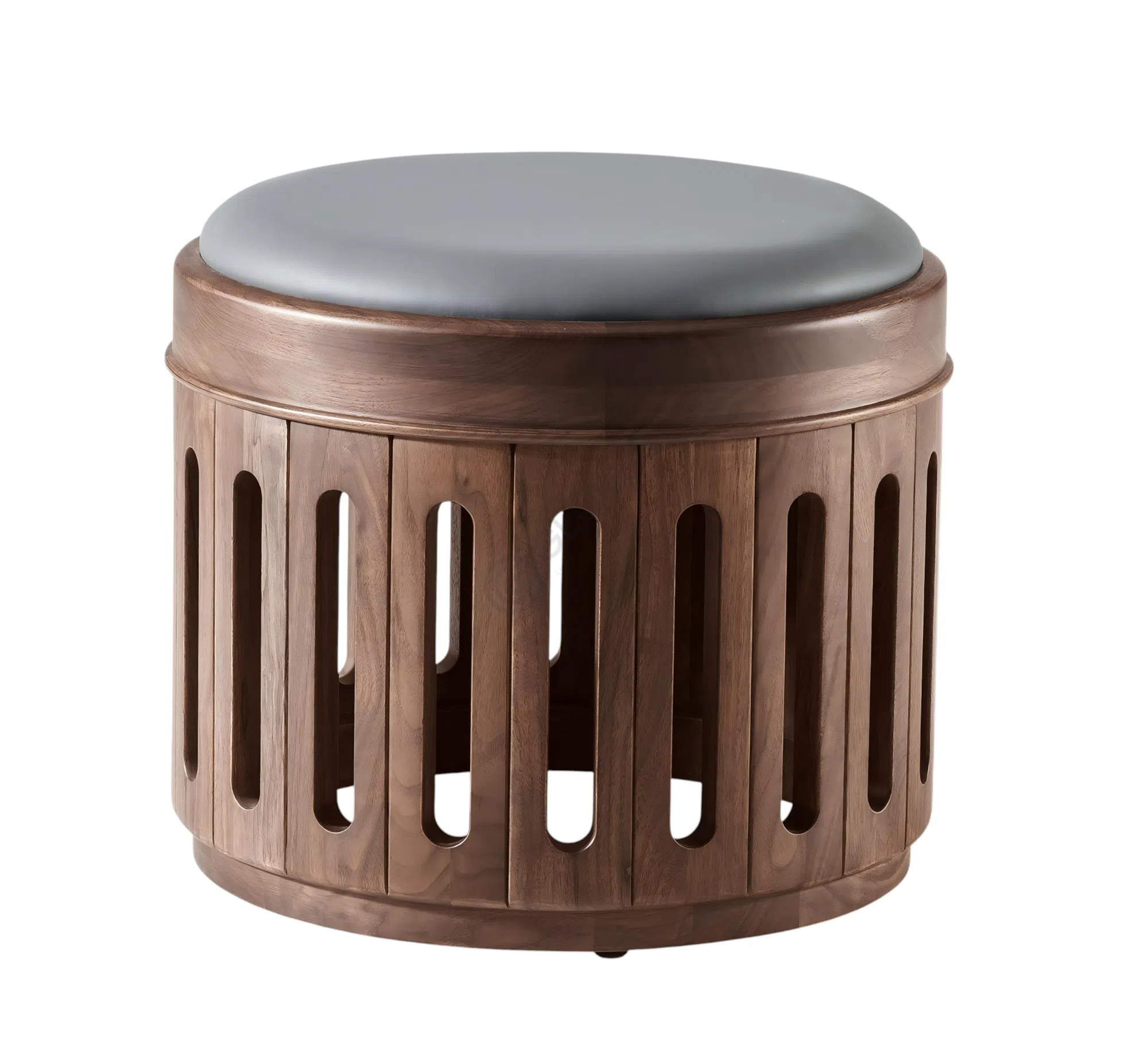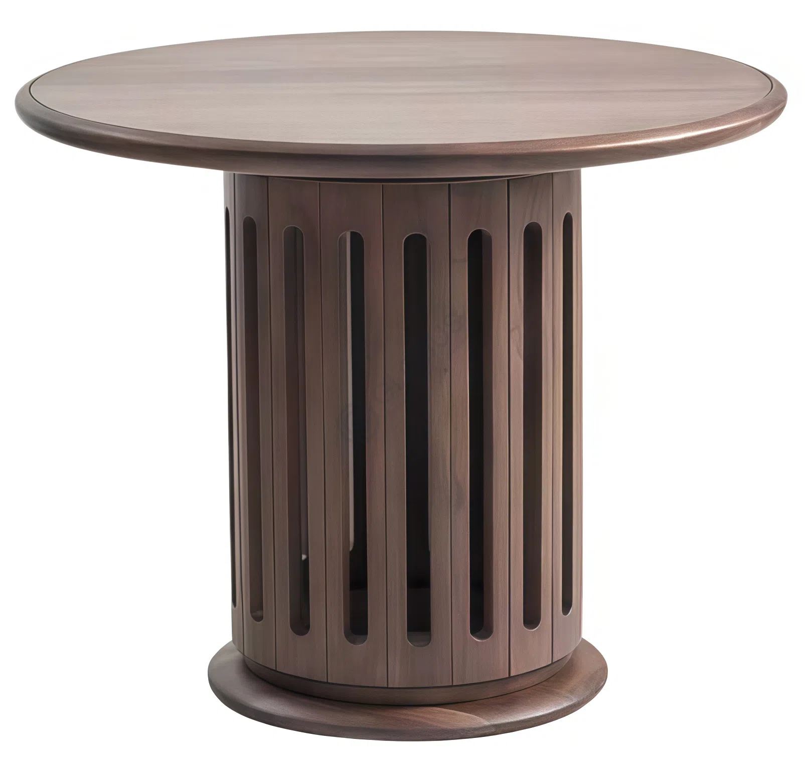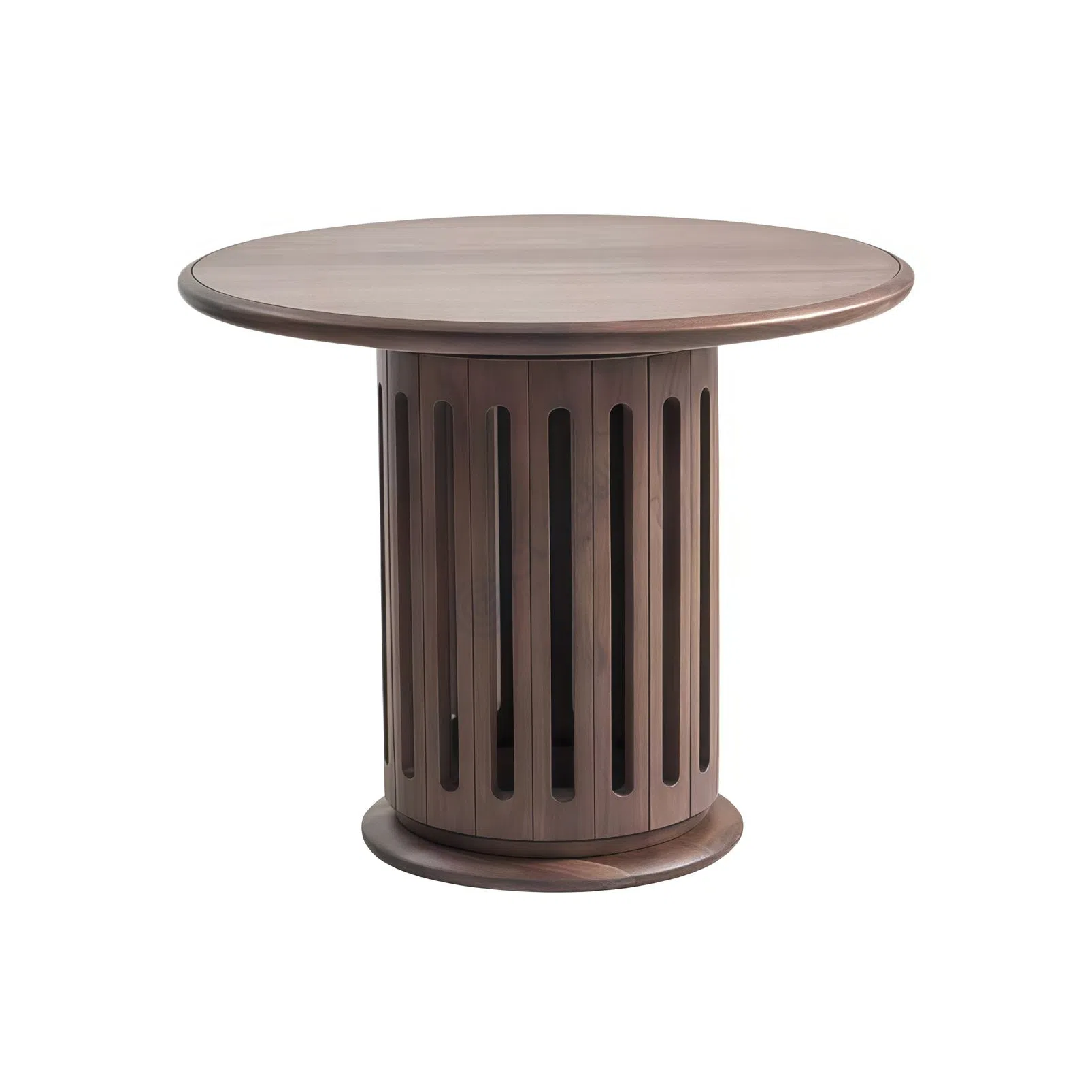 A round side table with a sculpted drum silhouette, defined by vertical slotted panels and a softly profiled top. The walnut-toned grain brings warmth to a living room, while the circular plinth base adds visual balance and stability.