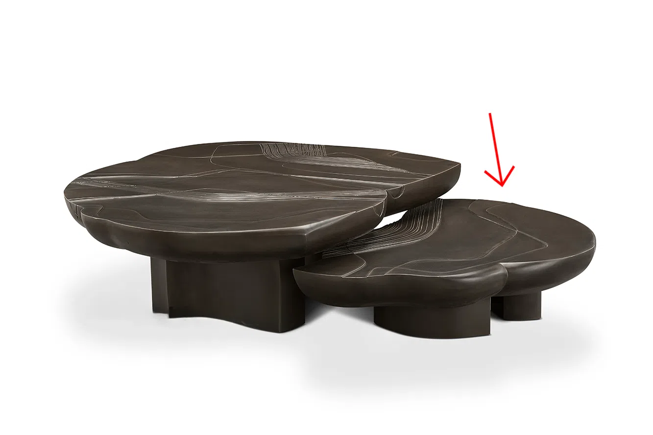 A modern side table with a sculptural presence, cast entirely in epoxy resin. The organically contoured top features refined linear engravings that catch the light, while rounded edges soften the bold silhouette. Four substantial legs ground the piece, finished in a subtle ombré that shifts from deep bronze to warm sand for a calm, contemporary look.