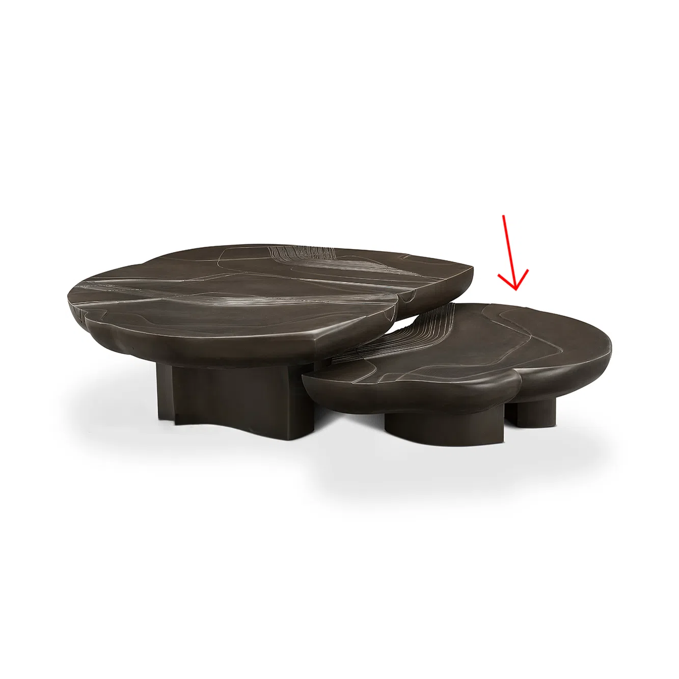 A modern side table with a sculptural, organic silhouette, crafted from solid wood. The thick, softly contoured top features subtle, graphic line carving that adds texture without overwhelming the form. A satin finish highlights the grain while lending a refined, contemporary character.