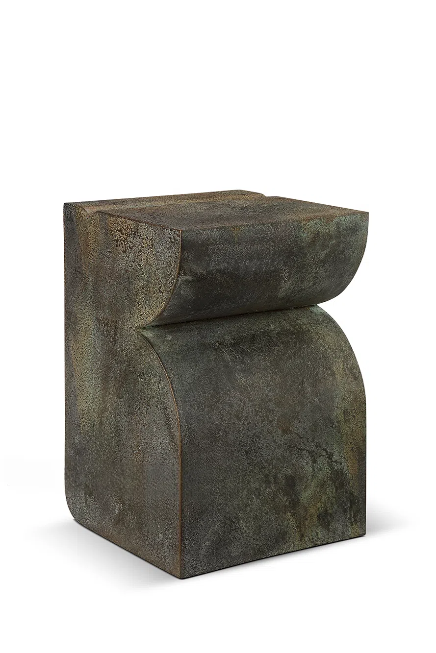 Cast in epoxy resin, it shows a mineral-like patina with layered charcoal and moss tones. The surface is smooth with a subtle matte sheen, and the seamless body emphasizes its clean geometry.