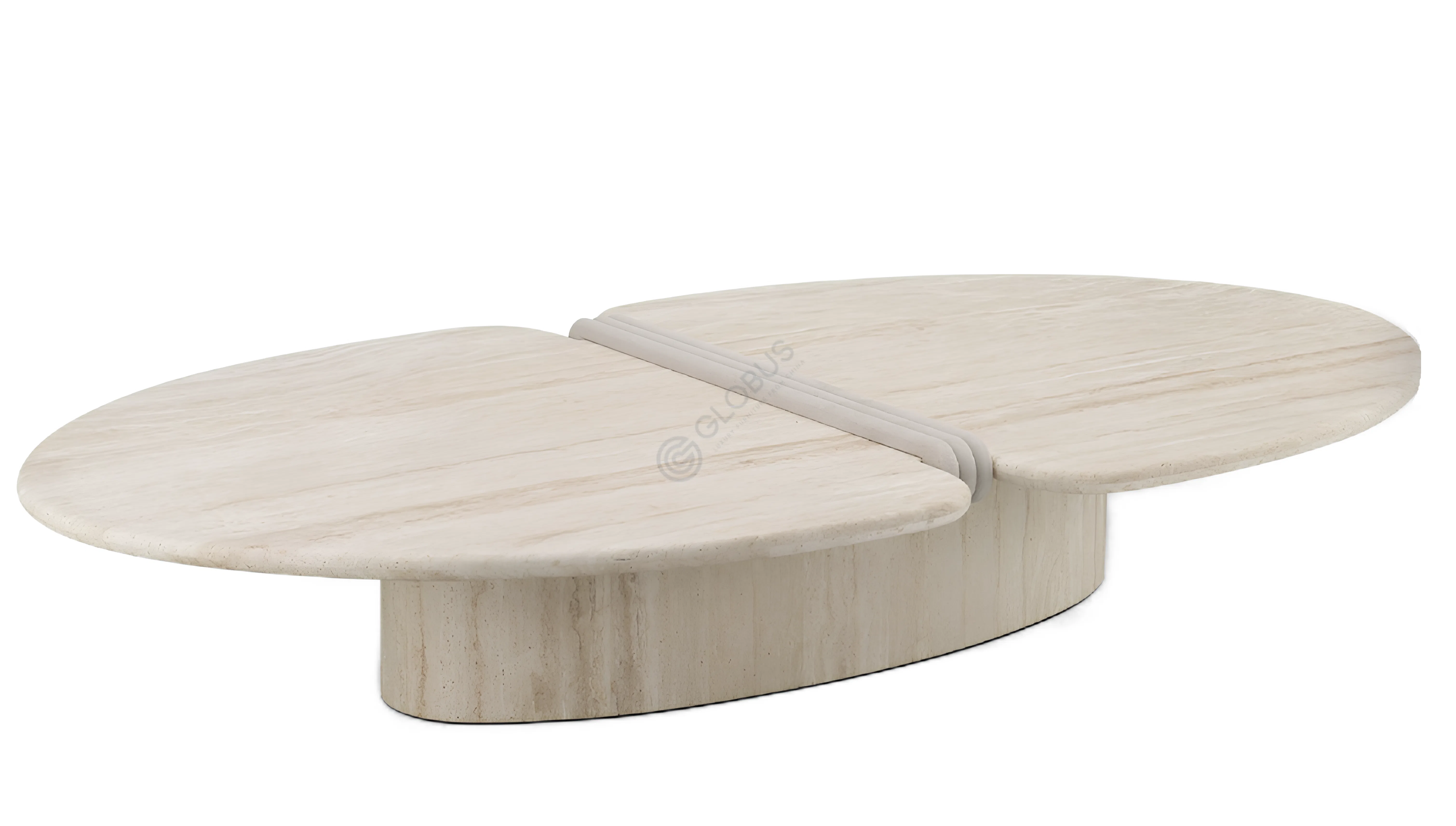 The console is made of natural travertine in a warm, light tone. Subtle pores and linear veining bring gentle texture and variation to the surface, ensuring an authentic stone character and a calm, tactile presence.