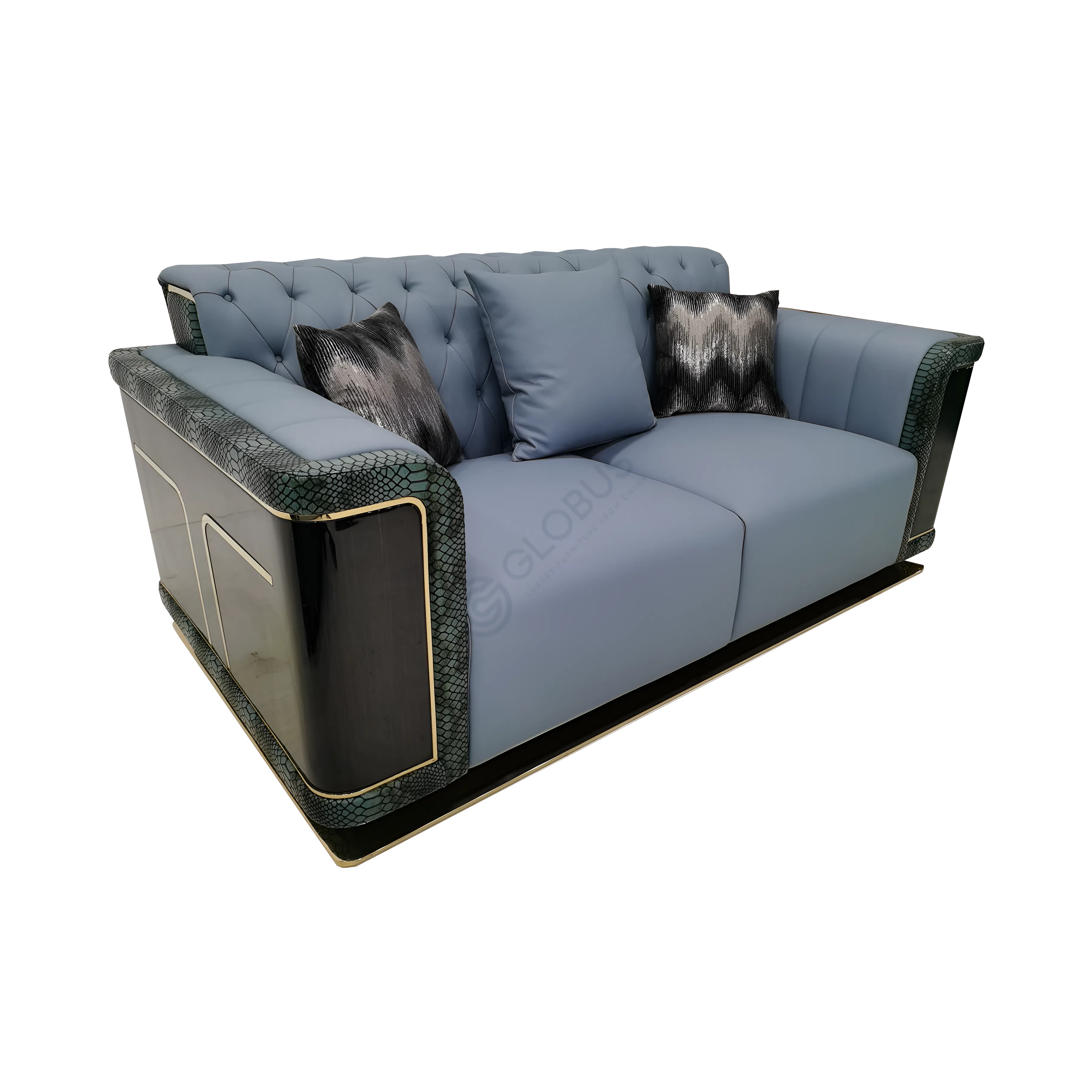 The exterior features sleek side panels expertly crafted from solid wood and plywood, finished with a deep, high-gloss natural veneer. These panels are elegantly adorned with polished metallic inlays, forming a refined geometric pattern. A striking textured trim, reminiscent of exotic skin in a deep teal, meticulously outlines the armrests and base, adding a layer of subtle luxury.