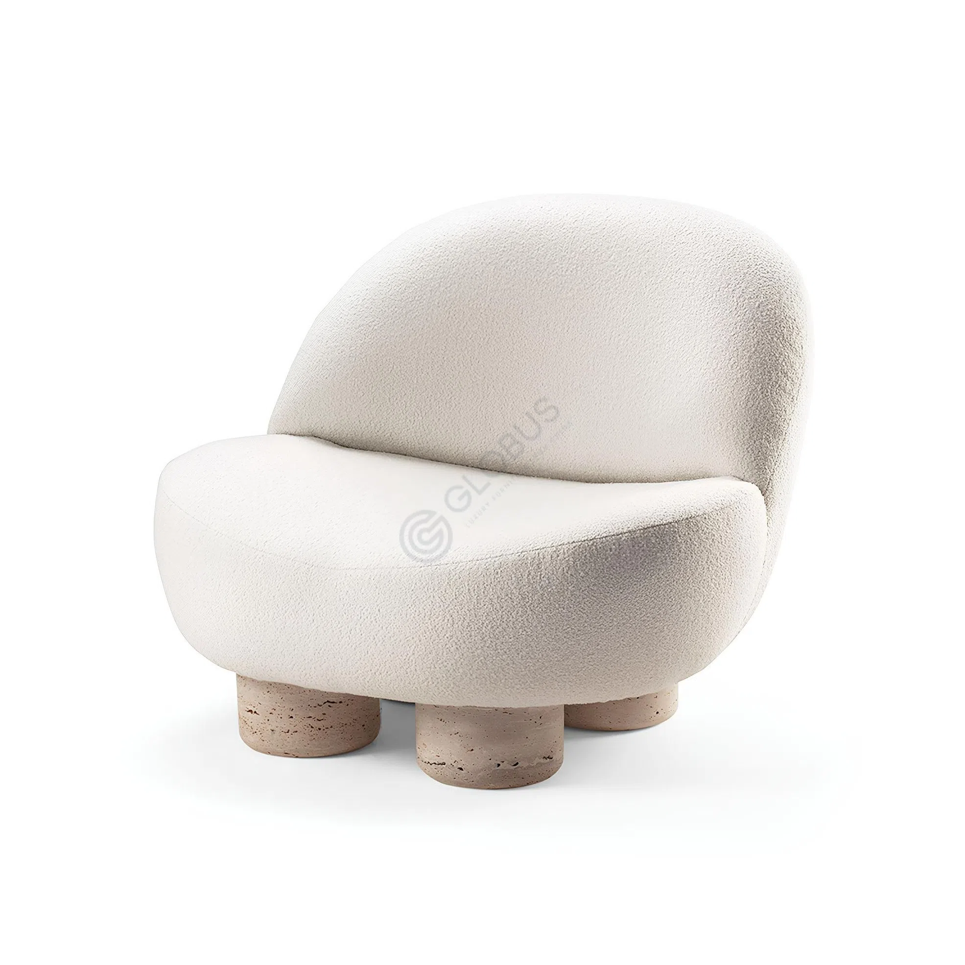 The tactile upholstery offers gentle comfort, and the plywood internal structure provides reliable support for everyday use. Natural variations in the travertine legs introduce subtle character and a grounded feel.