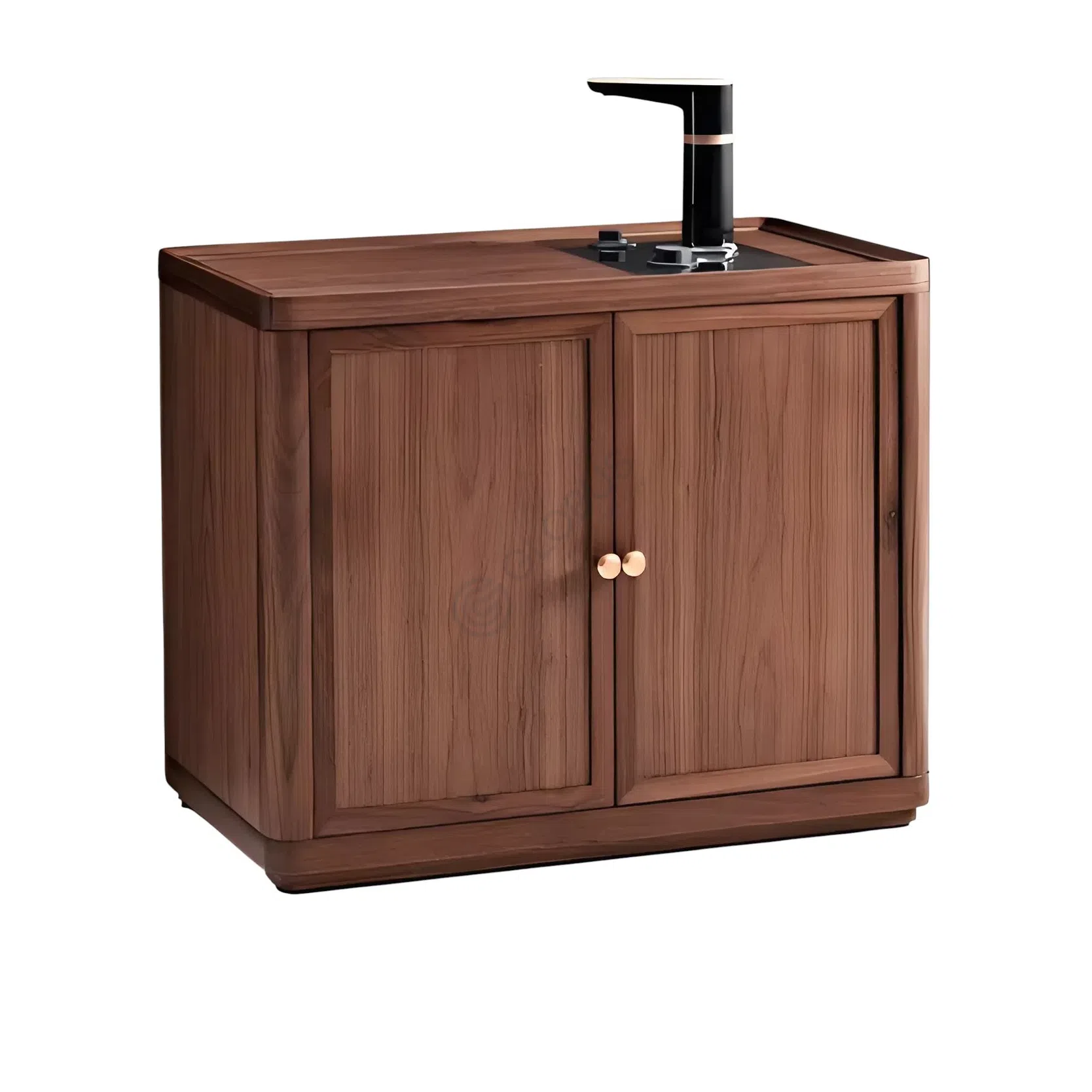This tea table presents a refined fusion of modern and Asian-inspired design, establishing an elegant focal point in any living room or home office. Its robust structure is expertly crafted from solid wood and natural veneer, creating a warm, inviting presence with clean, flowing lines.