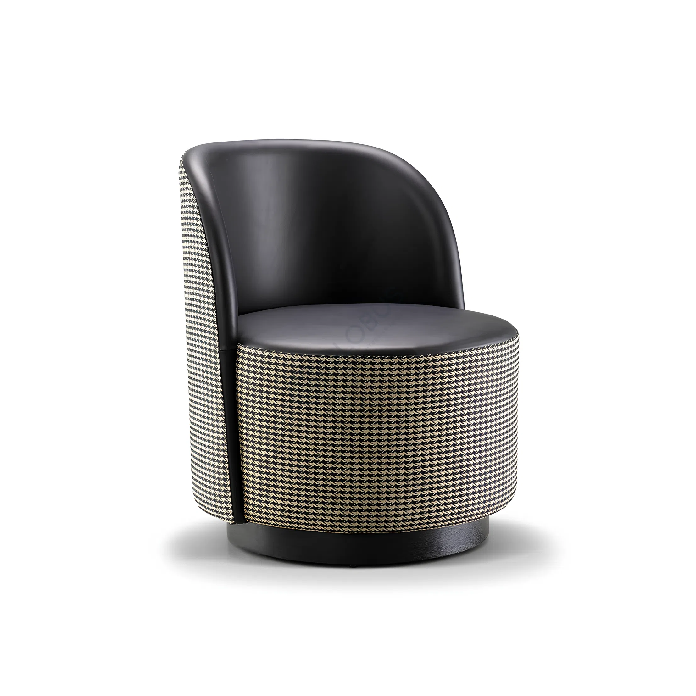Upholstered in a richly textured textile, the fabric’s deep, abstract pattern provides sophisticated depth to the surface. This tactile material is supported by a sturdy plywood frame, ensuring lasting durability. The chair rests upon a sleek, circular base of polished stainless steel, finished in a warm, radiant brass tone that introduces a touch of refined luxury.