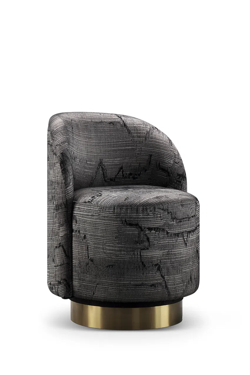 This modern armchair makes a distinctive statement with its elegant design. It features a gracefully curved backrest that provides a gentle embrace, harmoniously paired with a comfortable, circular seat.