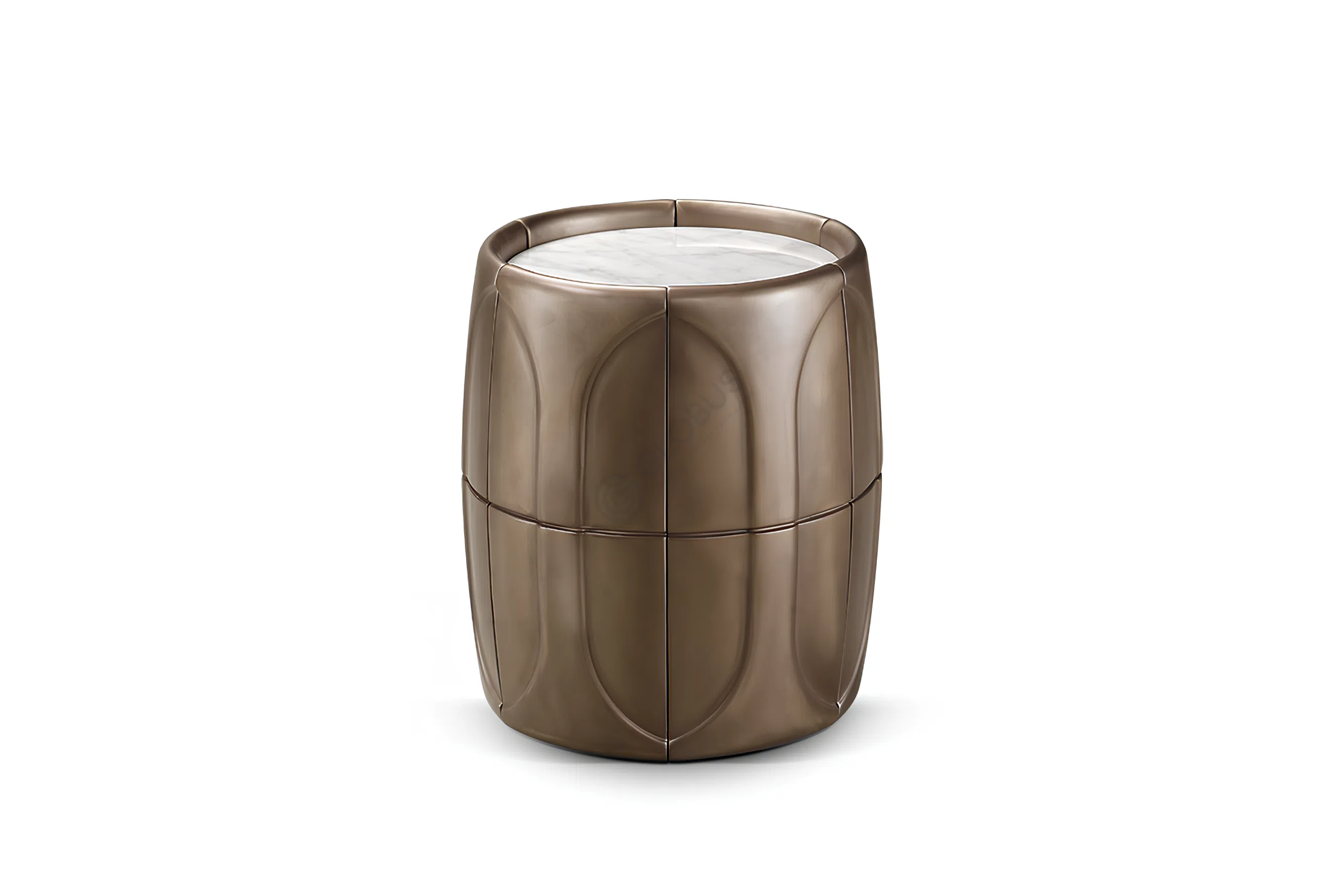 The table features a beautiful natural marble top, presenting a unique veining pattern that adds an element of organic elegance to its surface. Below, the sturdy MDF base is meticulously crafted with a distinctive, repeating oval motif, finished in a rich, warm bronze tone. This intricate detailing provides a subtle visual rhythm, transforming the base into an artful foundation.
