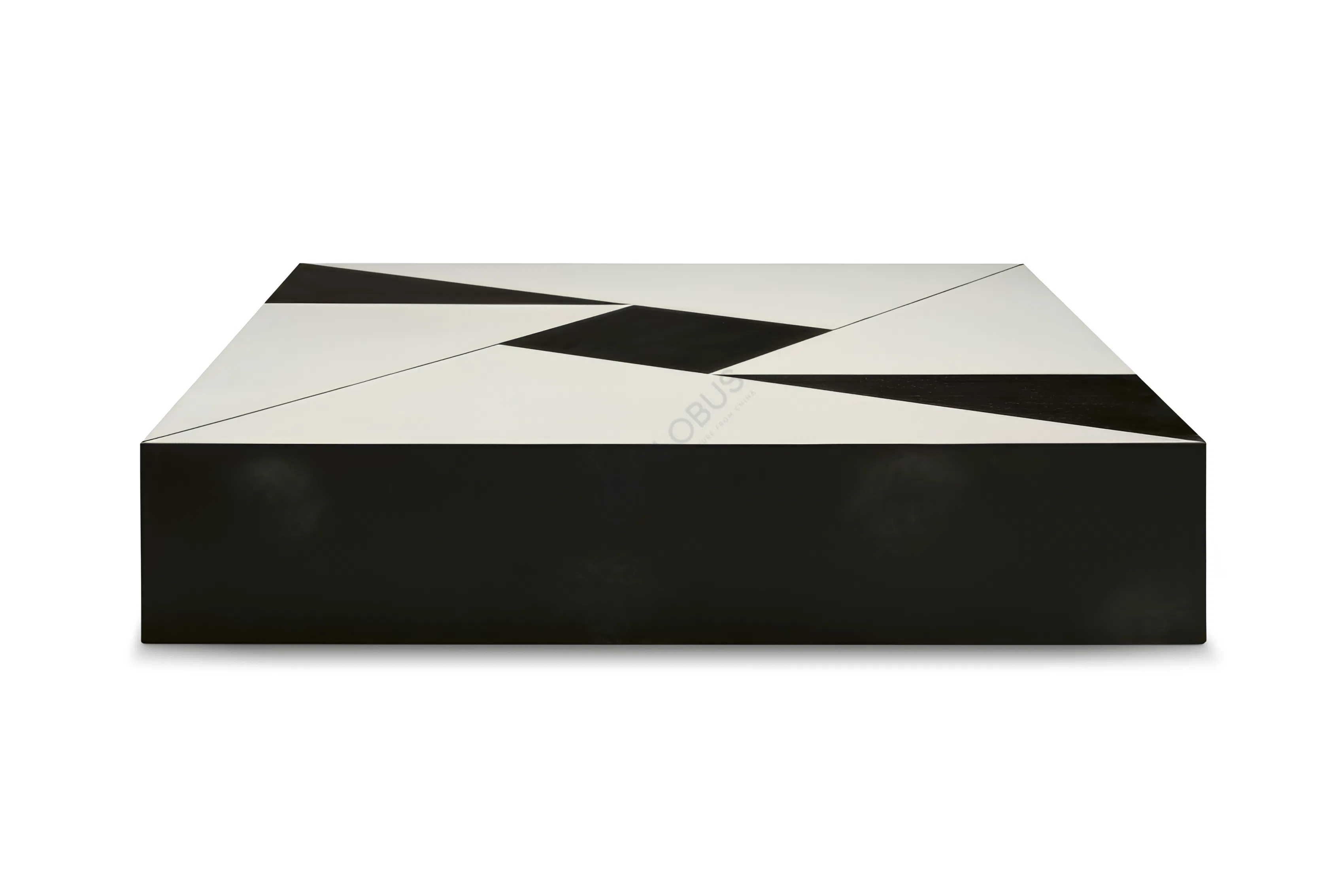 This modern side table presents a sophisticated cube, adorned with a dynamic black and white geometric pattern that creates a striking visual interplay. Its surfaces feature bold, abstract shapes, giving the piece an engaging, sculptural quality that instantly draws the eye and enhances any contemporary living space.