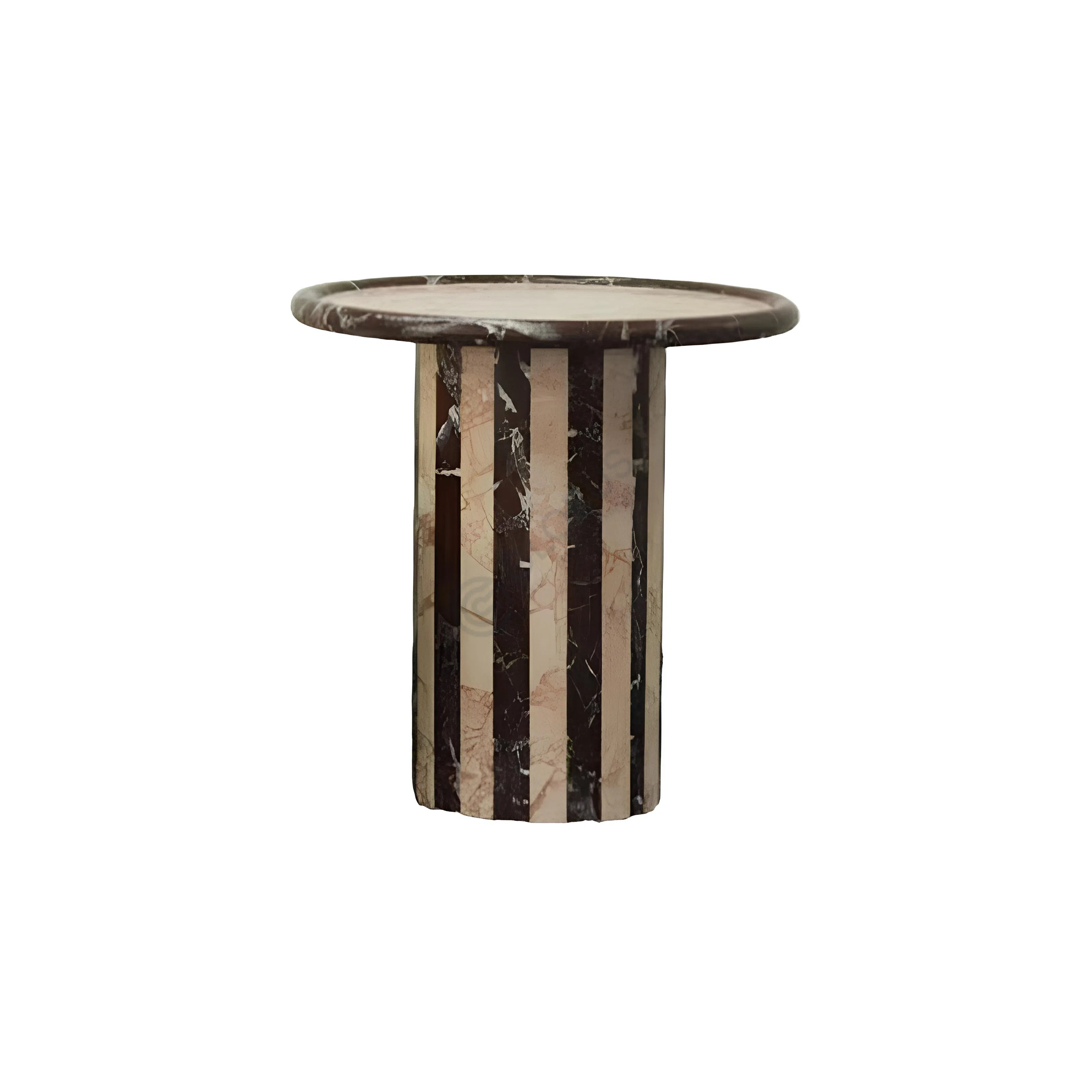 The table features a smooth, light marble top, subtly veined, which is elegantly framed by a darker marble border. This contrast draws the eye to the surface. Below, a robust cylindrical base showcases an impressive vertical striped pattern, created by carefully cut and arranged alternating shades of natural marble. Each stripe reveals the unique geological patterns of the stone, ensuring a one-of-a-kind piece.