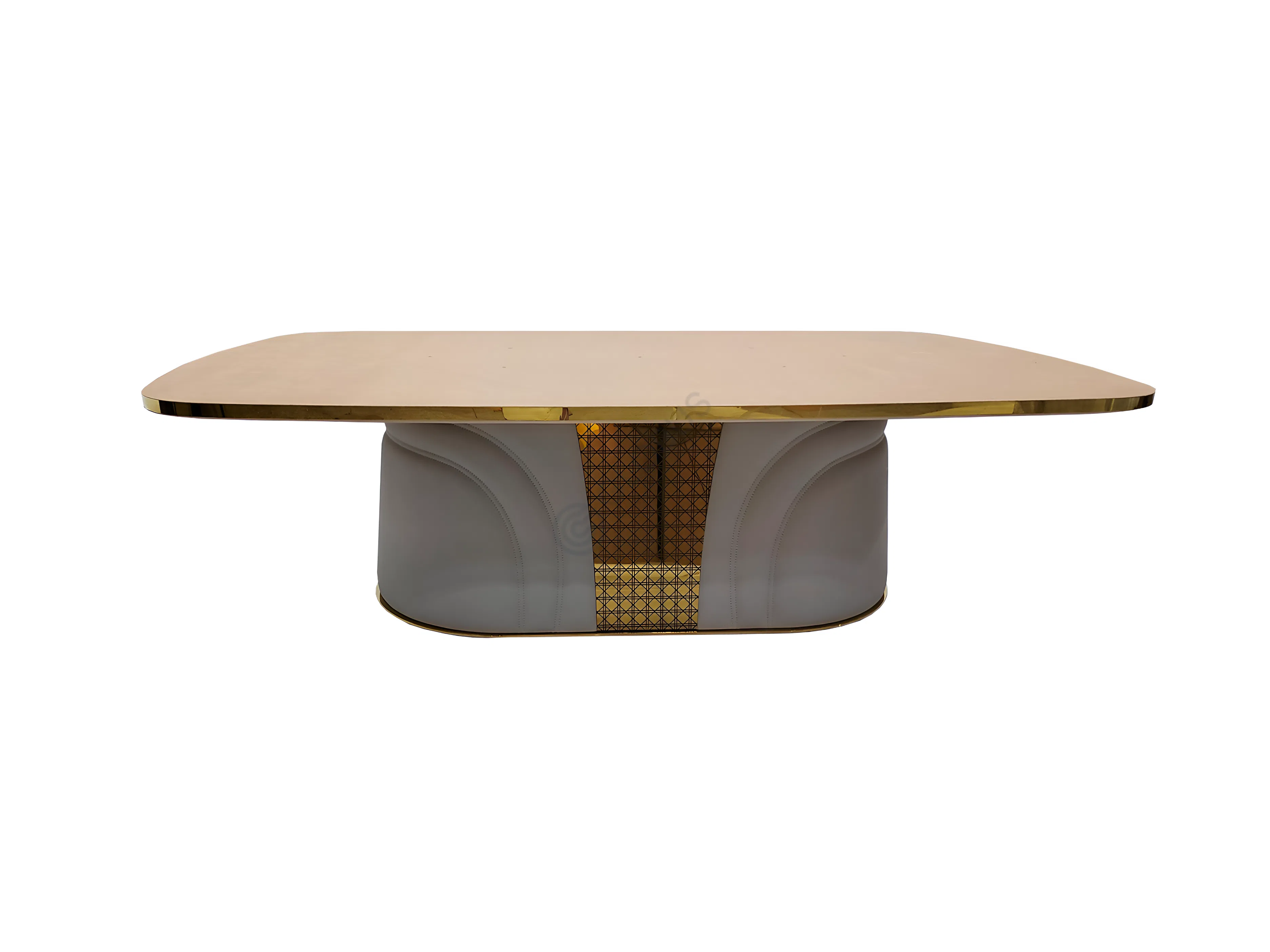 The table's striking pedestal base is wrapped in soft, high-quality microfiber leather, adorned with a delicate stitched pattern that adds depth and texture. A central vertical panel of stainless steel, finished in a complementary gold tone, accentuates the base with an intricate geometric design. This detail elevates the table, transforming it into a statement piece.