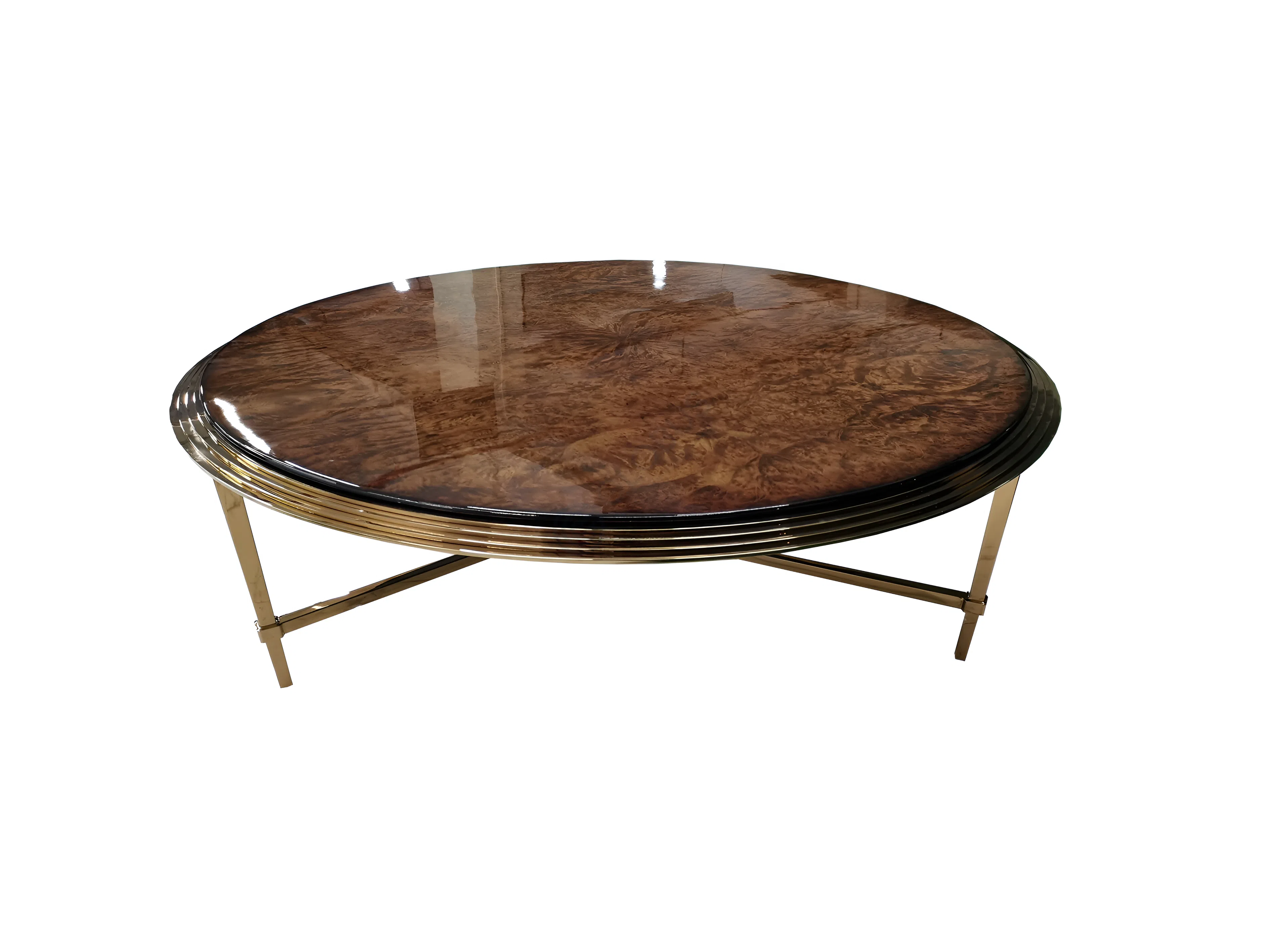The circular tabletop features a natural wood veneer, showcasing a captivating pattern with deep, warm tones. A high-gloss finish enhances the wood's intricate grain, creating a luxurious surface that reflects light beautifully. This central element provides a sense of organic elegance.