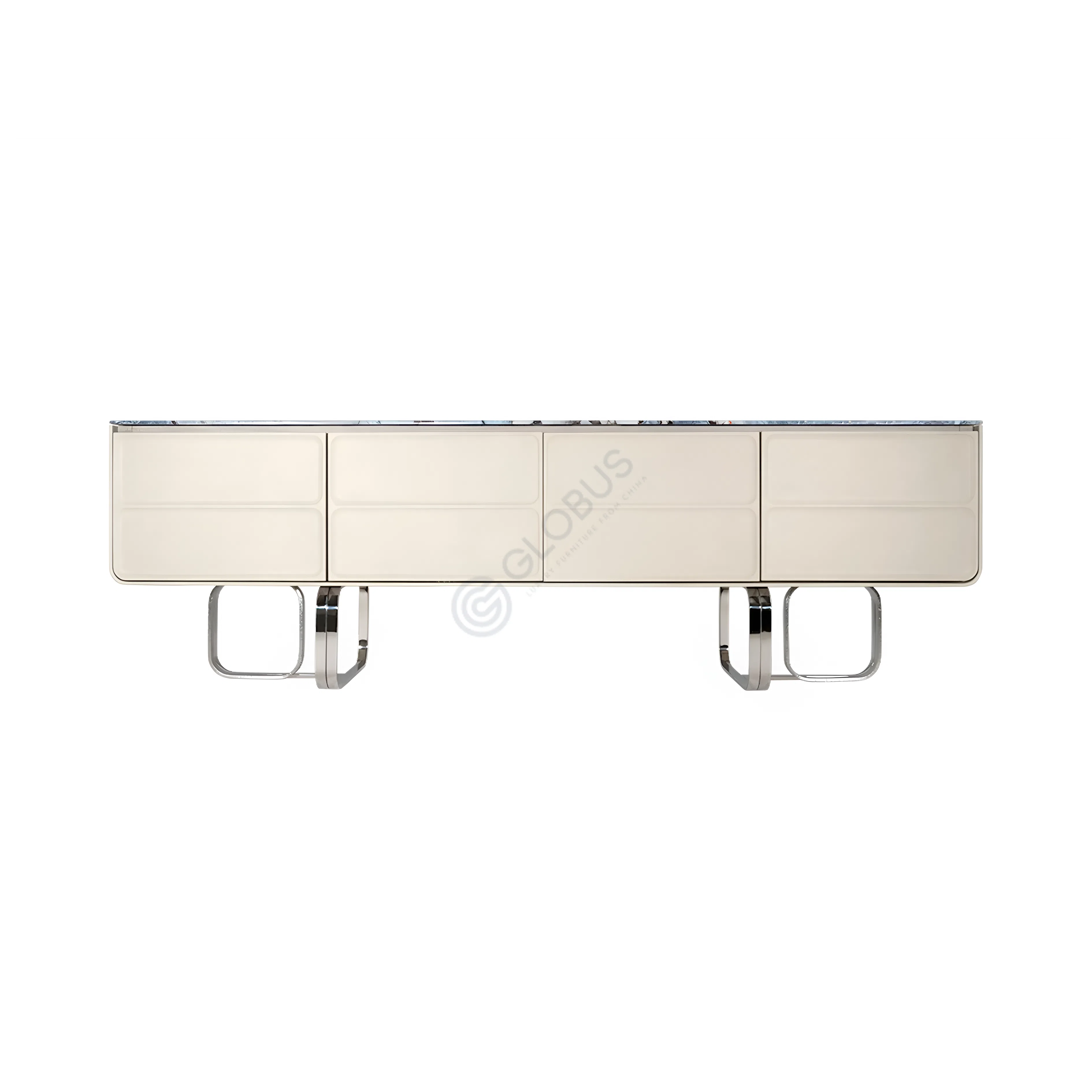 The cabinet stands on a distinctive base of polished golden stainless steel legs. These sculptural elements create an open and airy foundation, adding a unique architectural touch that complements the clean lines of the upper structure. The generous internal storage remains seamlessly integrated, maintaining the piece's streamlined aesthetic.