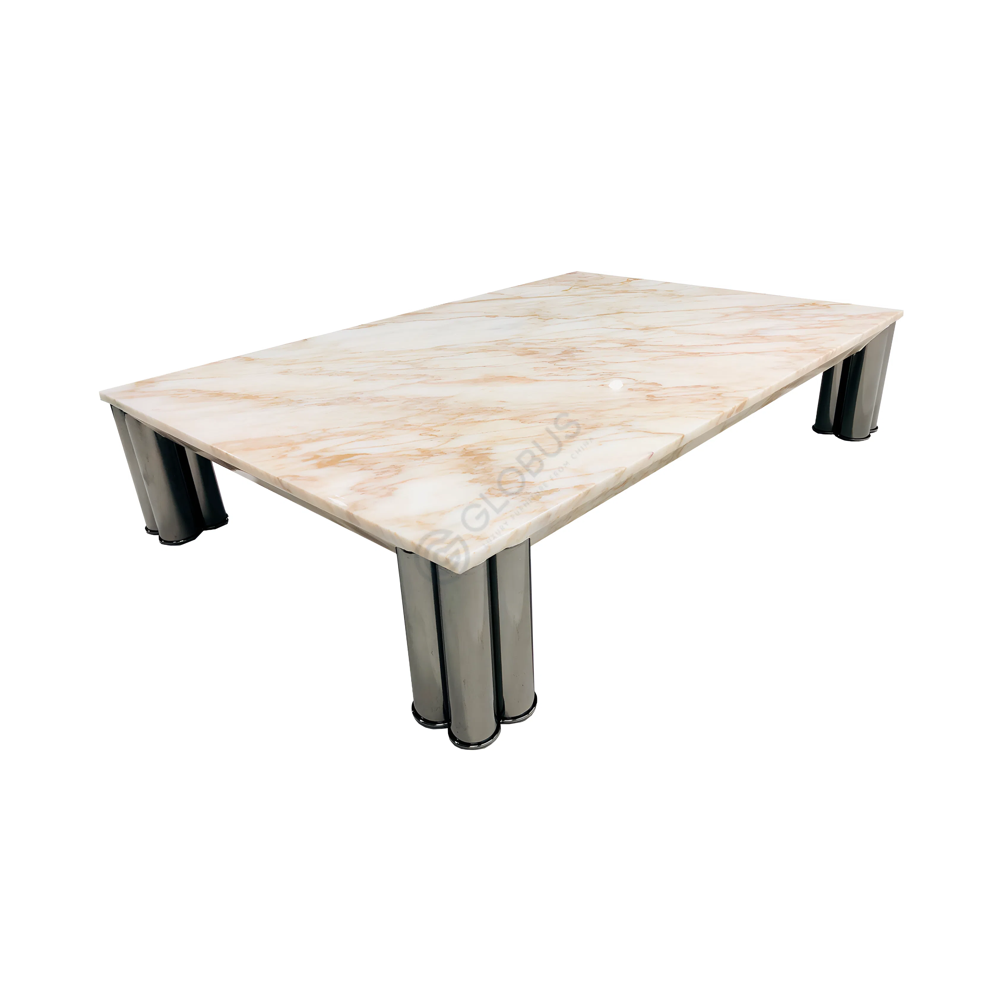 The table is supported by a robust pedestal base made from stainless steel. This base comprises several vertical cylindrical tubes resting on a sturdy round plate, providing both exceptional stability and a sleek, contemporary aesthetic. The brushed finish of the stainless steel harmonizes with the marble top, reinforcing the table's sophisticated design.