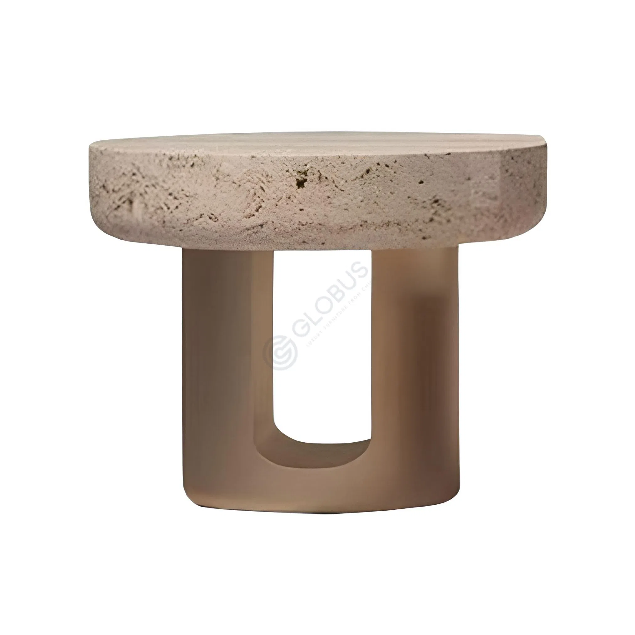 The circular top and robust body are formed from exquisite travertine, showcasing its inherent beauty. Each table features unique veining and subtle textures, a testament to the stone's natural origin. This material provides a warm, tactile surface that invites interaction.