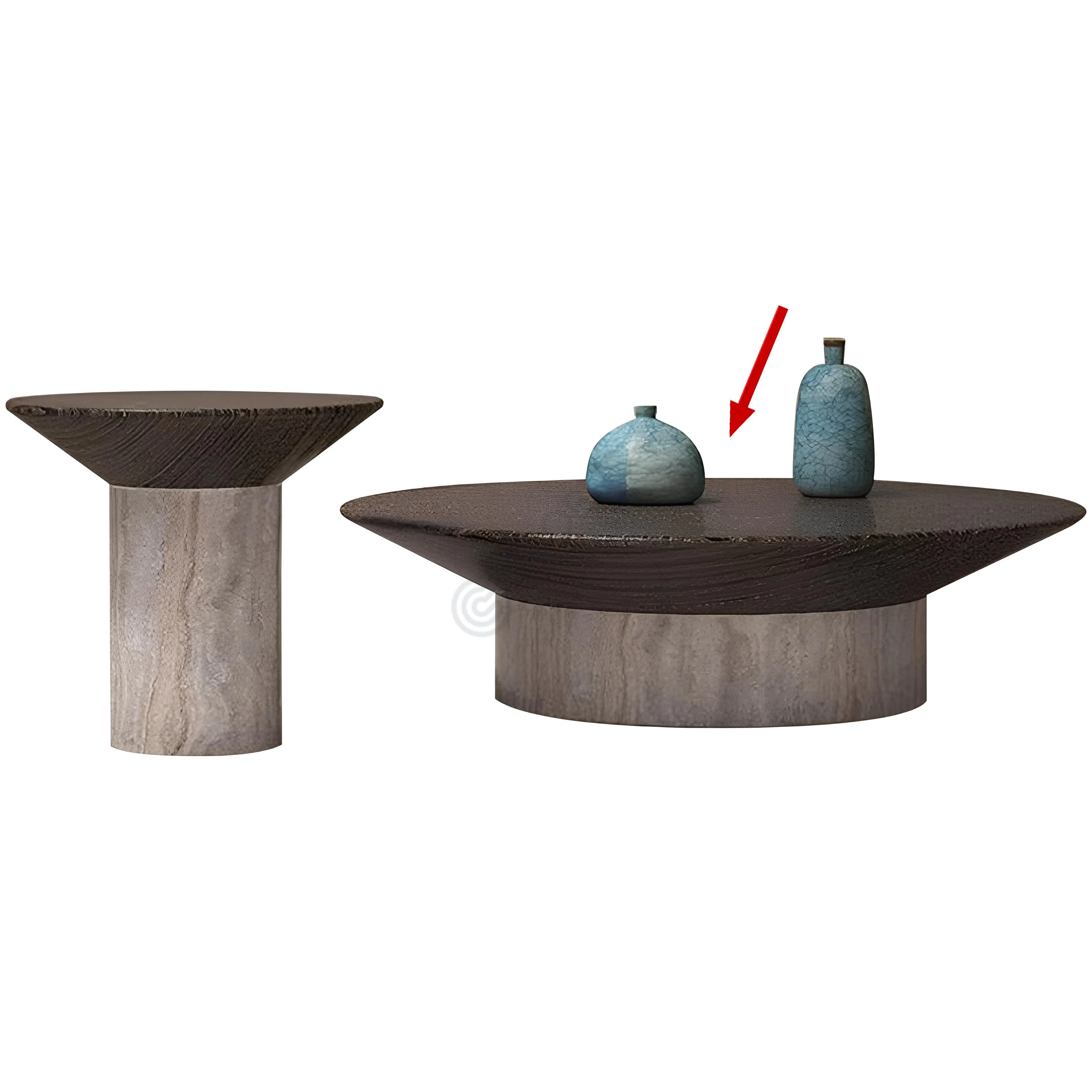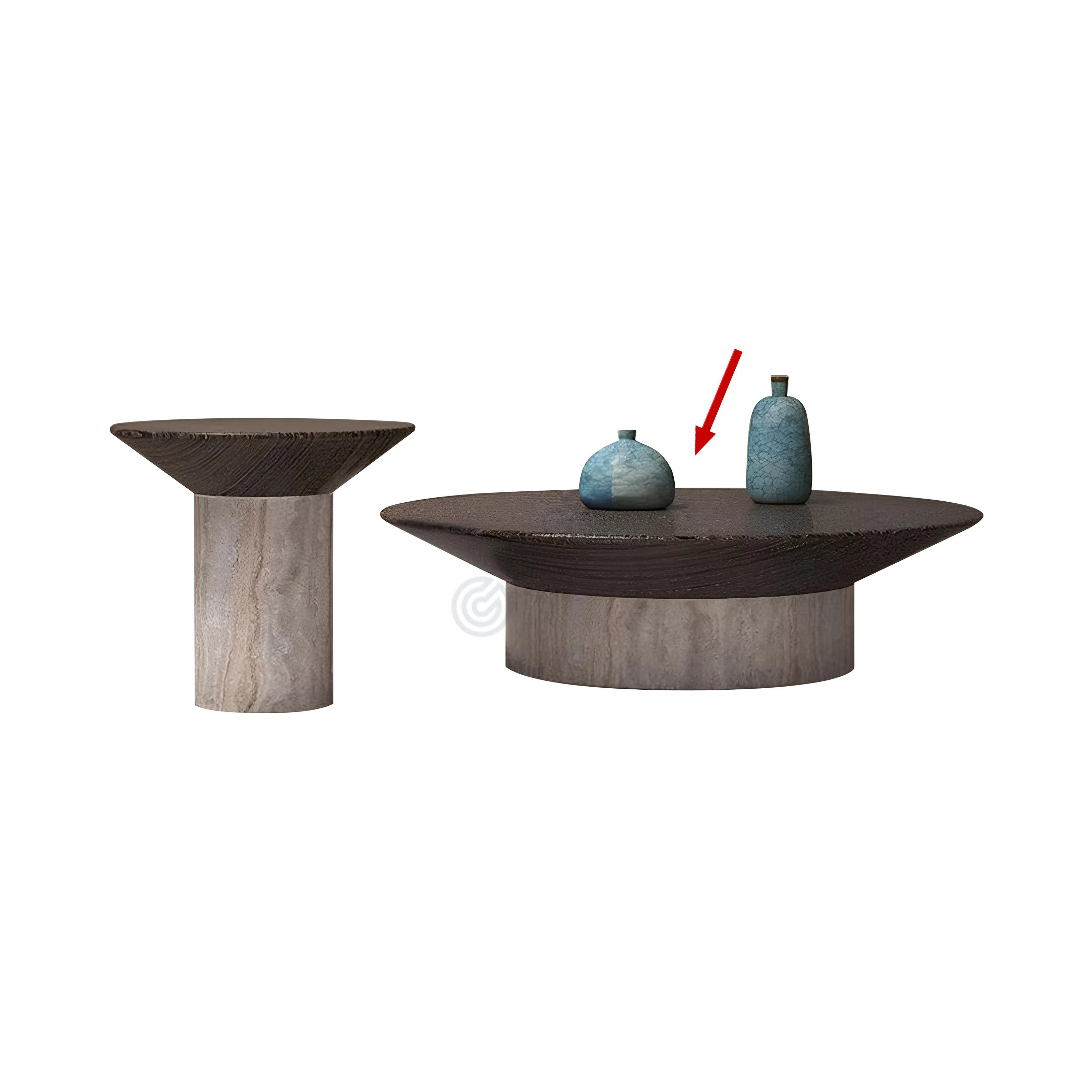 The table features a solid cylindrical base of exquisite travertine, showcasing its inherent beauty with distinctive natural veining and a gentle, earthy texture. This sturdy foundation supports a thoughtfully designed plywood top, finished in a deep, rich tone with a subtle, tactile grain. The contrast between the light, organic stone and the dark, refined wood creates a harmonious interplay.