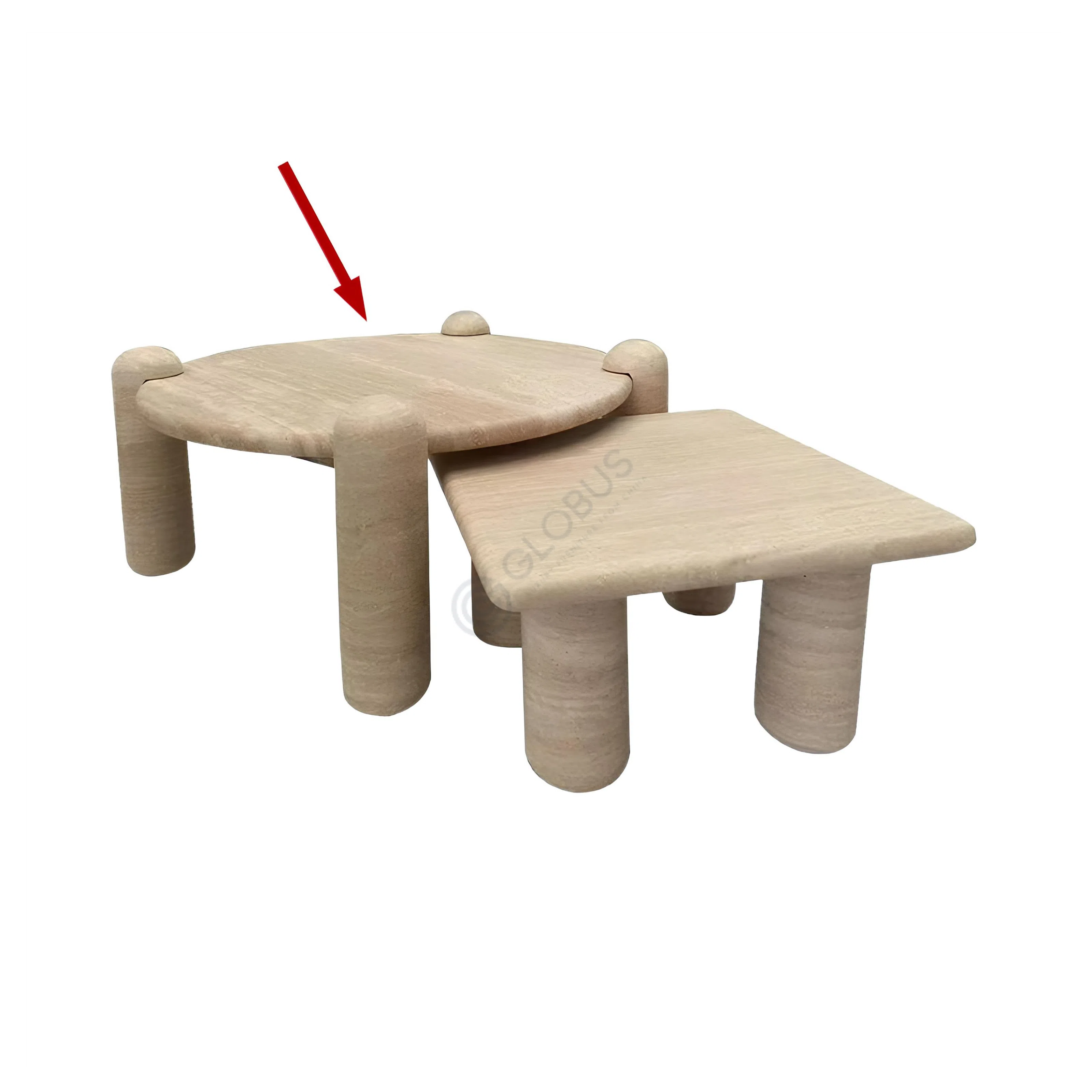 The table's design features a robust top with gently rounded edges, supported by equally substantial, cylindrical legs. This soft contouring provides a pleasing visual contrast to the solid travertine, creating an inviting and sculptural piece. The thoughtful construction ensures both stability and a sophisticated aesthetic that complements a range of interior palettes.