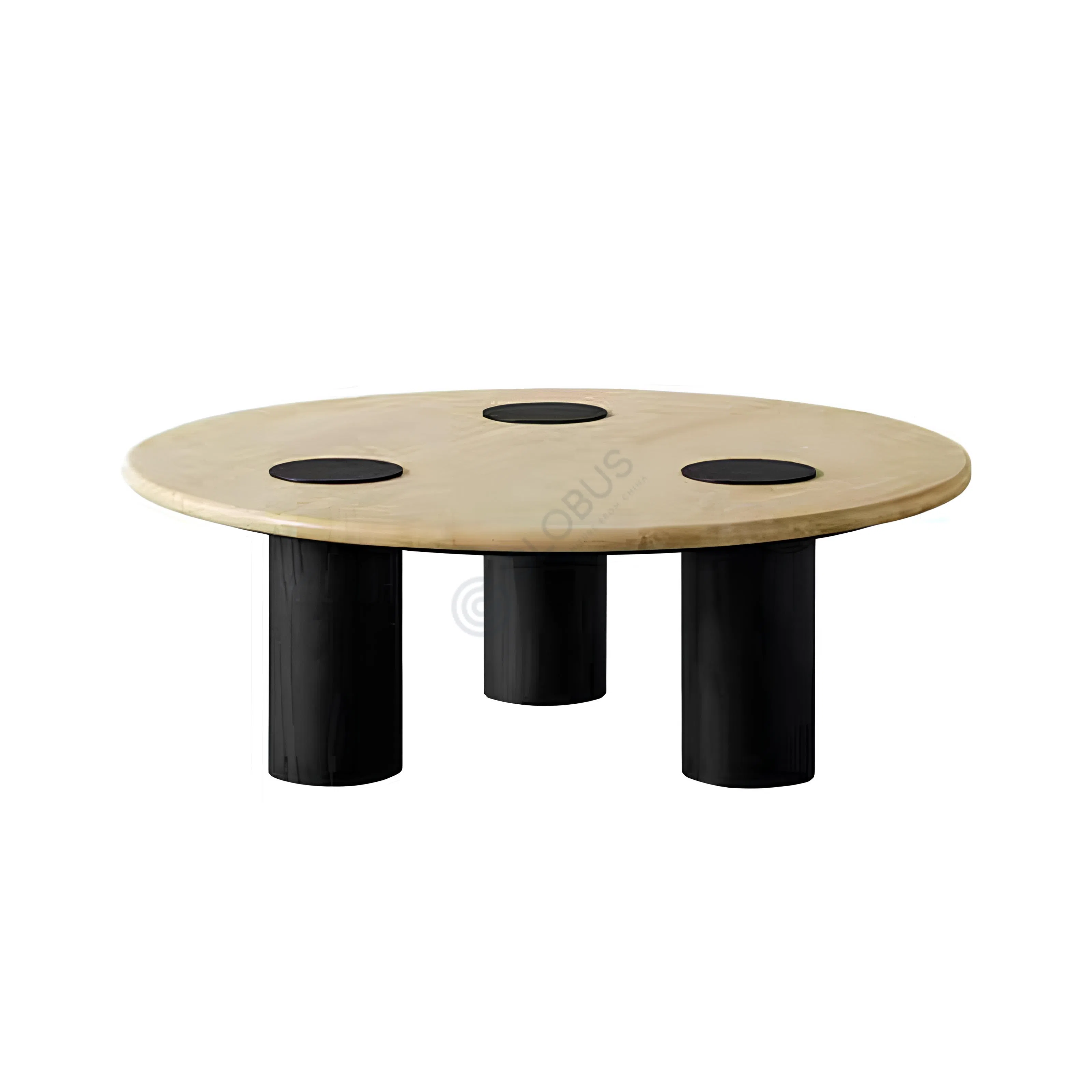 The side table presents a distinct modern form, thoughtfully crafted from a refined blend of natural materials. It features a circular top made from beautiful travertine, showcasing its unique natural patterns and warm, inviting tones. This natural stone surface is elegantly balanced by three substantial cylindrical legs, fashioned from solid wood with a deep, dark finish.