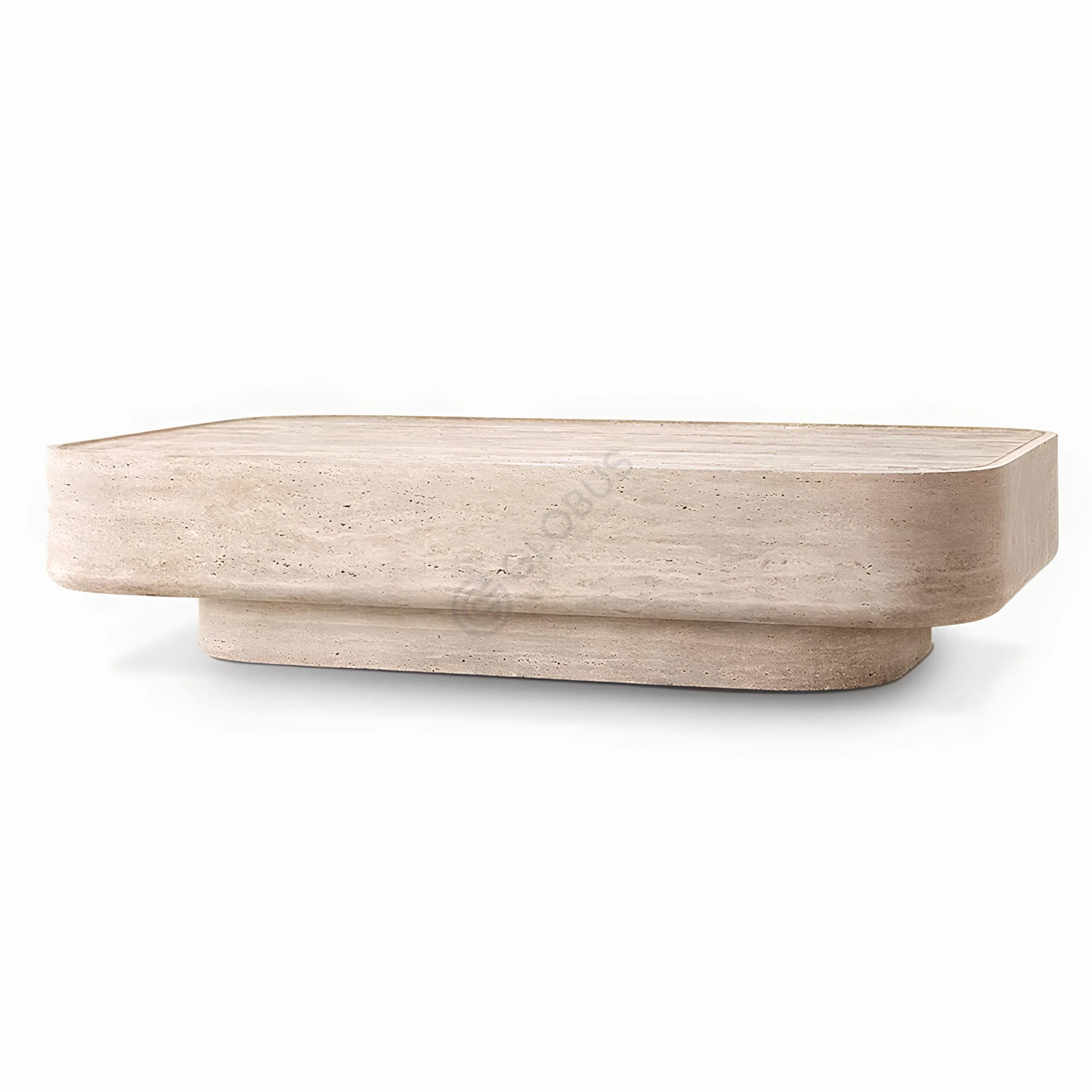 The design features a rectangular top with gently raised edges, creating a subtle tray effect that is both practical and visually appealing. This rests upon a robust, sculptural pedestal base, with all edges thoughtfully rounded to soften its architectural presence. The natural variations in the travertine stone ensure each console possesses a unique character, showcasing delicate veining and pores that speak to its geological origin.