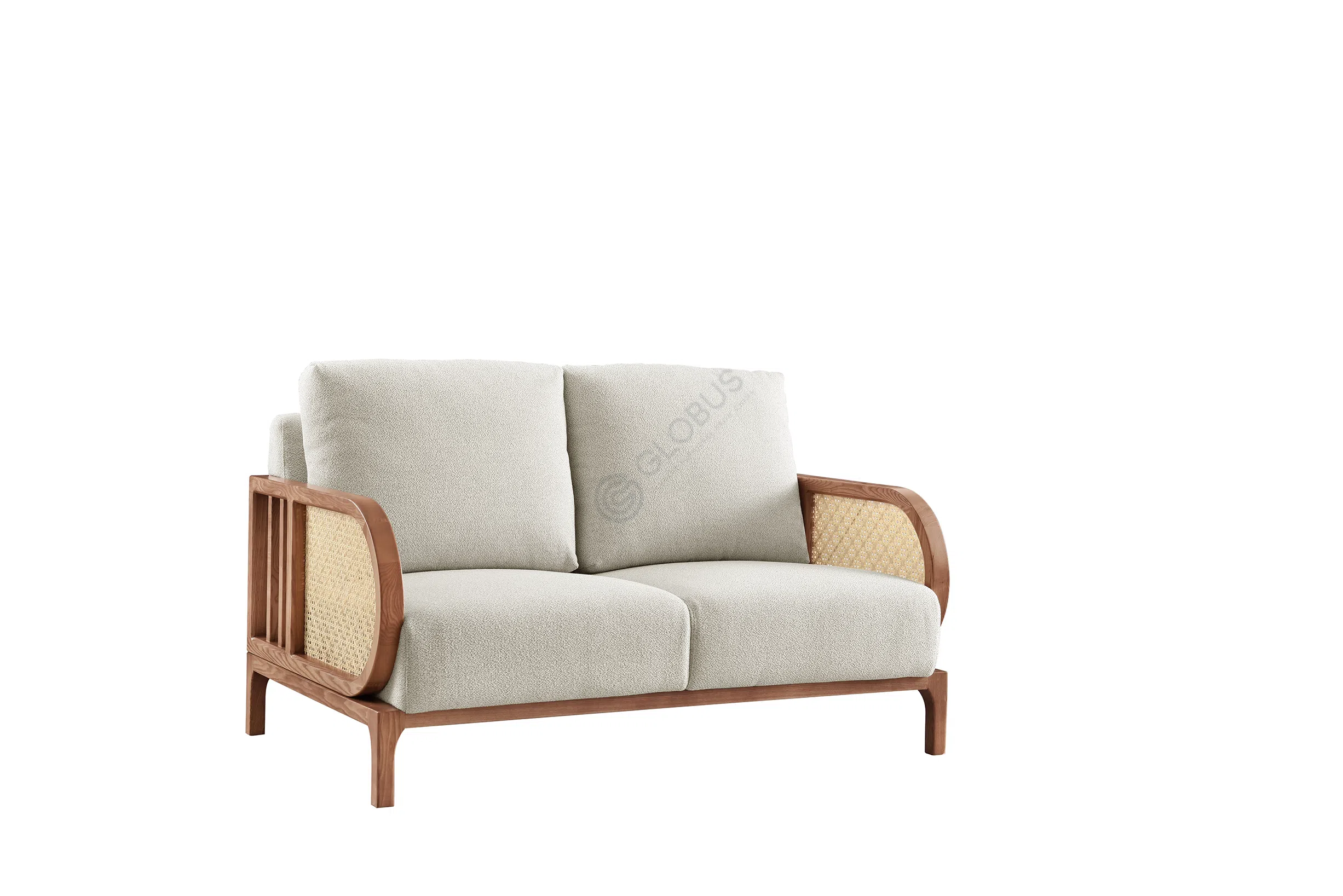 Crafted from solid wood, the frame showcases a rich, warm finish that provides a sturdy foundation. Graceful curves on the armrests are complemented by panels of natural rattan, meticulously woven to create an inviting texture and visual lightness. The seat and back cushions are generously padded and upholstered in a premium textile, offering a soft, refined feel in a versatile, neutral tone.