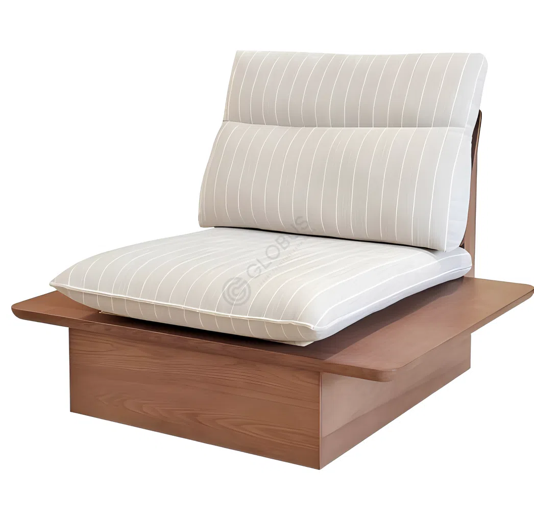 The comfort experience is enhanced by plush textile cushions that invite relaxation. The back cushion features a subtle, refined pattern, adding visual depth, while the seat cushion provides soft yet firm support. A notable design element is the gently extended wooden base on each side, serving as a convenient platform for everyday essentials.