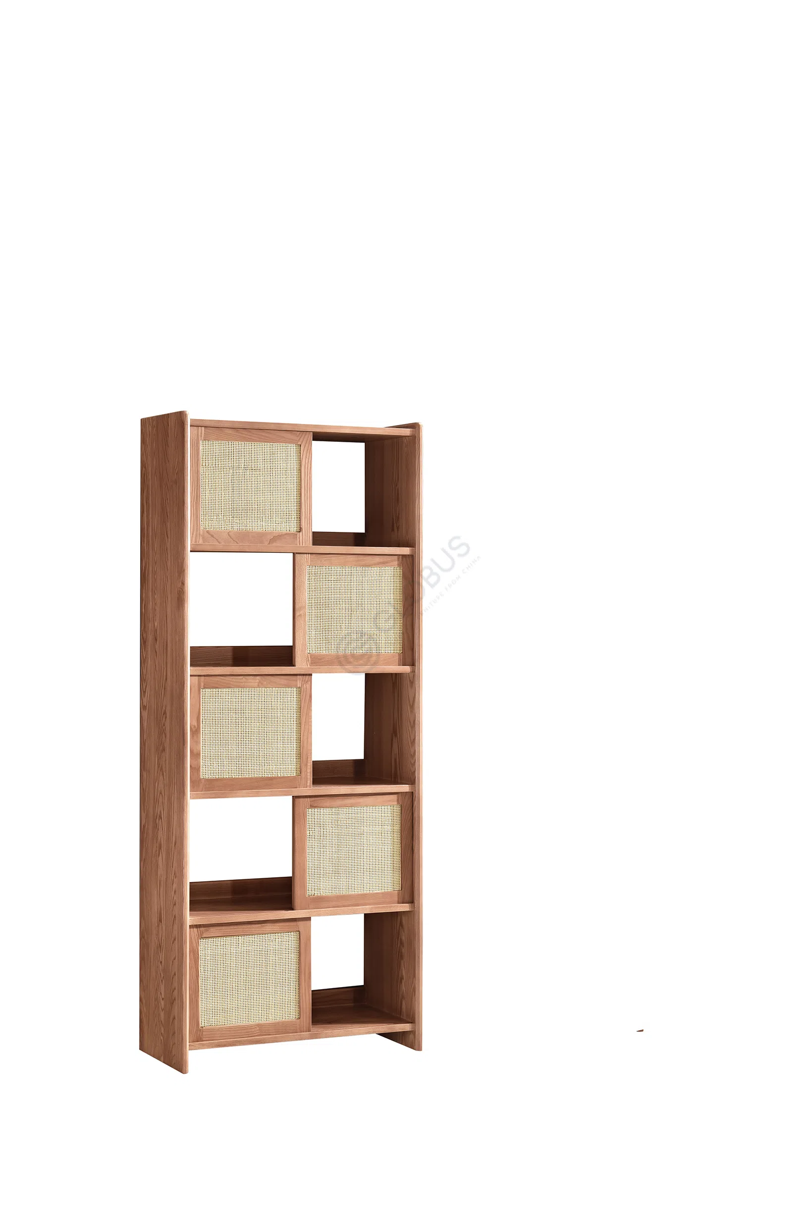 This bookshelf introduces a refined aesthetic, blending the robust character of solid wood with the delicate texture of natural rattan. Its modern, eco-style design presents a serene and elegant presence, ideal for a contemporary living room or a productive home office.