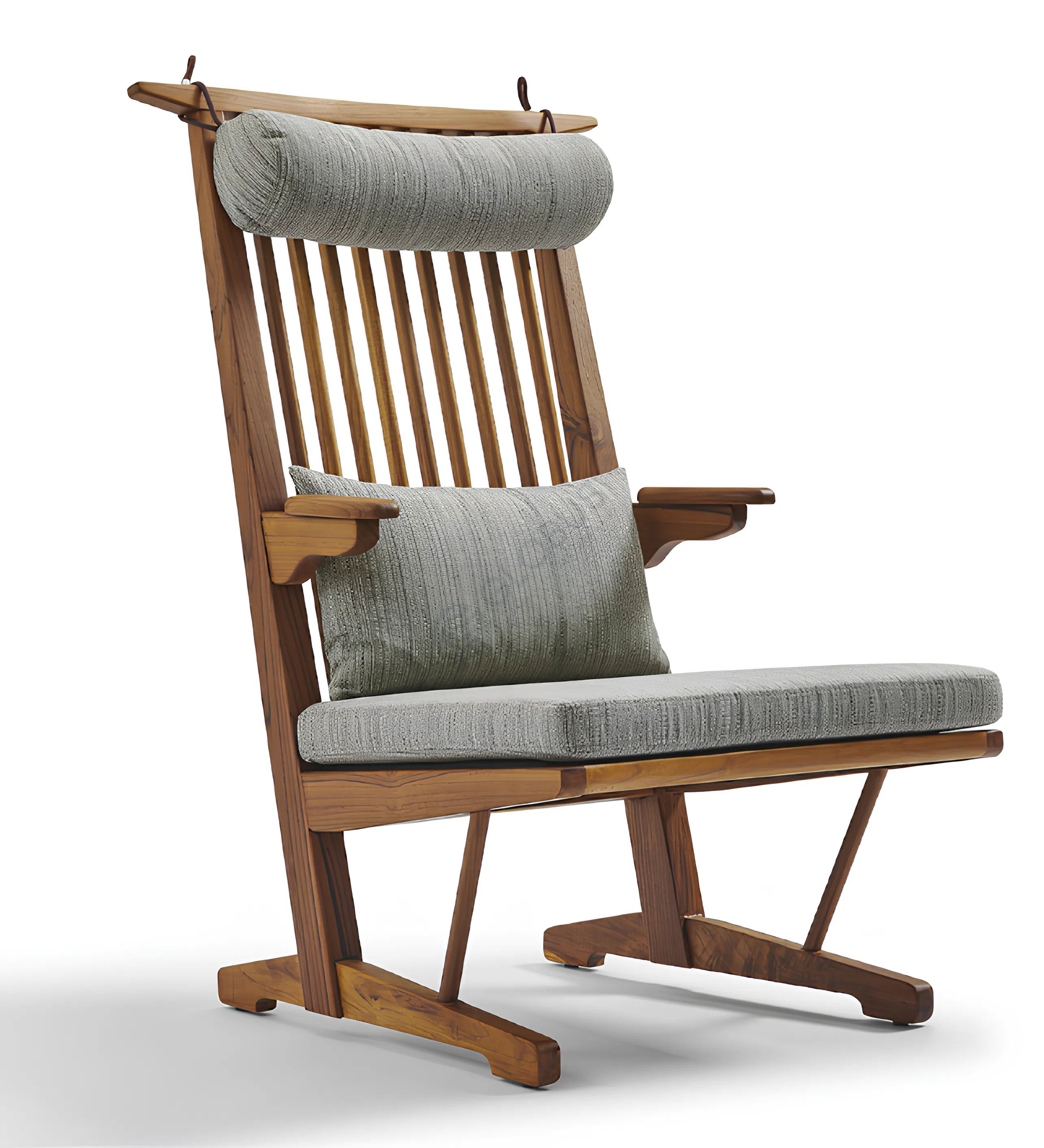 Comfort is thoughtfully integrated into its sophisticated form. A plush textile seat cushion provides a soft foundation, complemented by two strategically placed bolster cushions. One offers gentle support for the head, while the other cradles the lower back, ensuring a relaxed posture. The elegant slatted backrest contributes to both the visual lightness and structural integrity of the piece.
