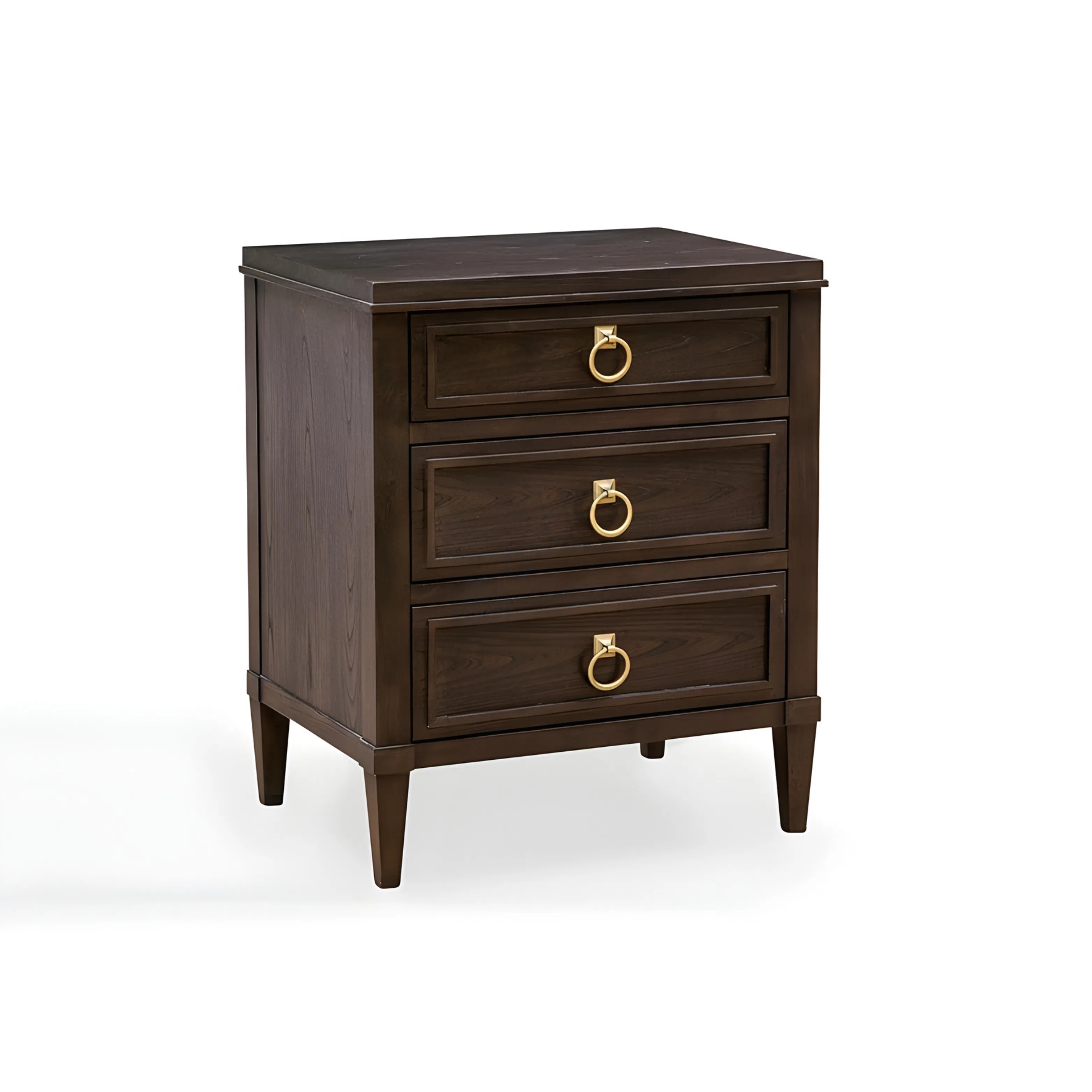 The frame is crafted from solid wood with MDF used for stability and finished in natural veneer for depth of tone. Stainless steel ring pulls and leg caps in a warm brass hue add a refined accent without overpowering the design.