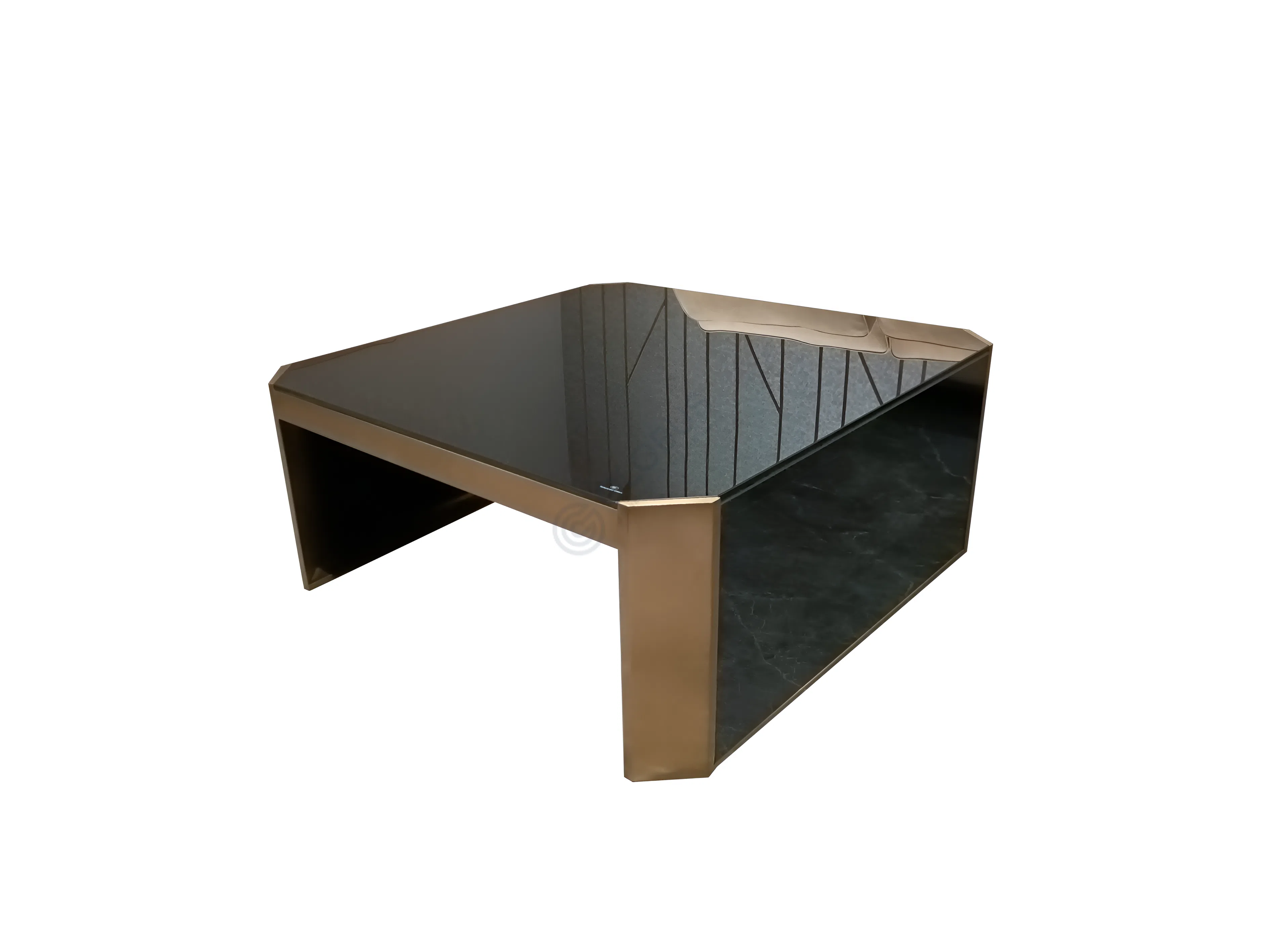 Crafted from polished stainless steel and high-quality dark glass, the console showcases refined elegance. The stainless steel frame, finished in a warm, inviting tone, outlines the console's geometric precision. Its glass surfaces, sleek and reflective, reveal a sophisticated dark tint with subtle, elegant veining, adding depth and visual interest while maintaining a minimalist aesthetic. The two distinct heights create a dynamic, layered profile.