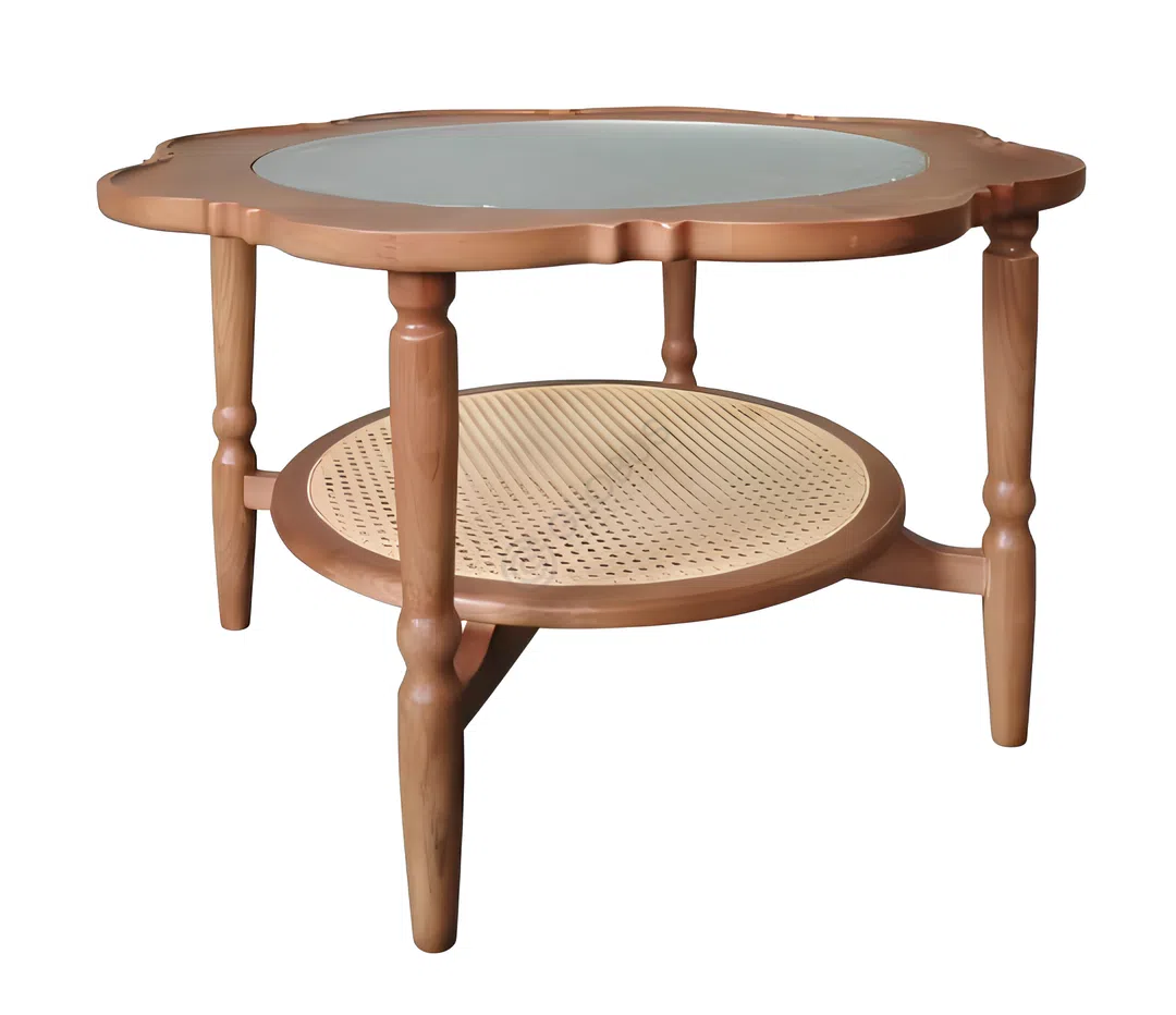 The structure is crafted from solid wood for lasting stability. A recessed glass surface is easy to wipe clean and sits flush for a comfortable, practical top. The rounded lower shelf offers an extra spot for a book, remote, or a small plant.