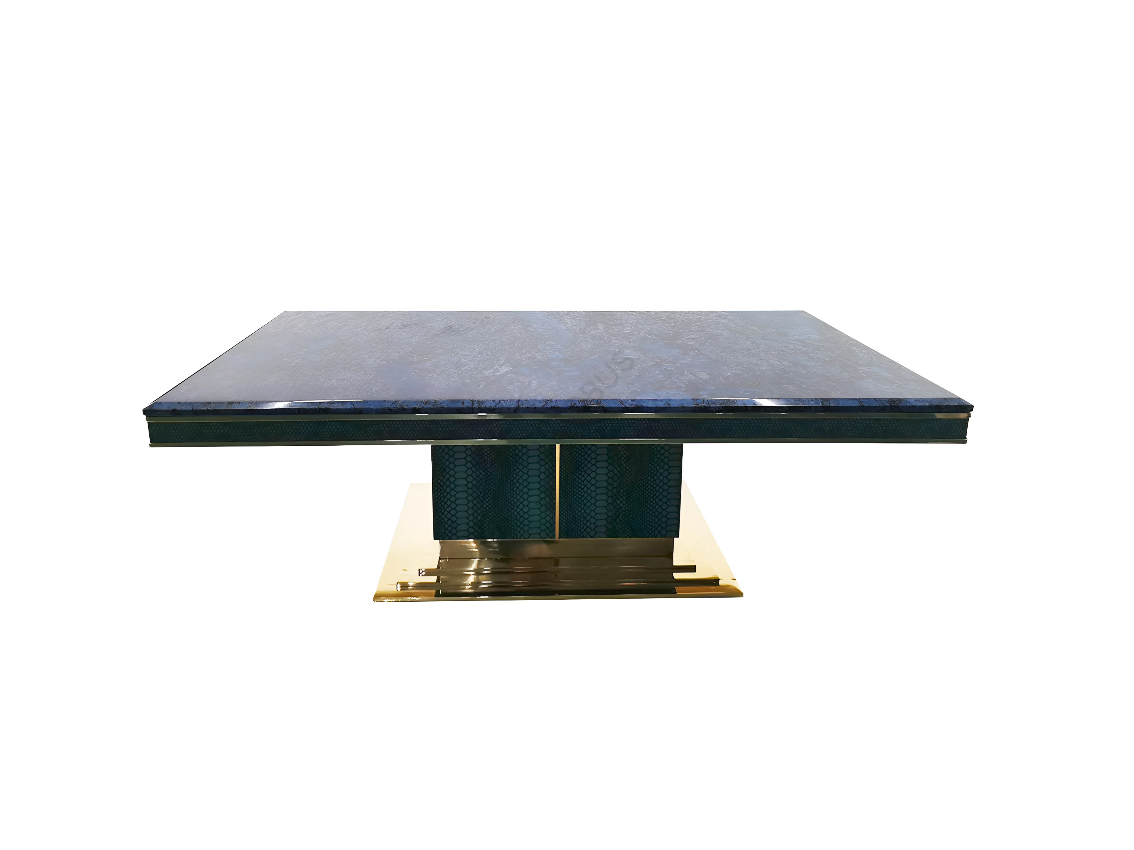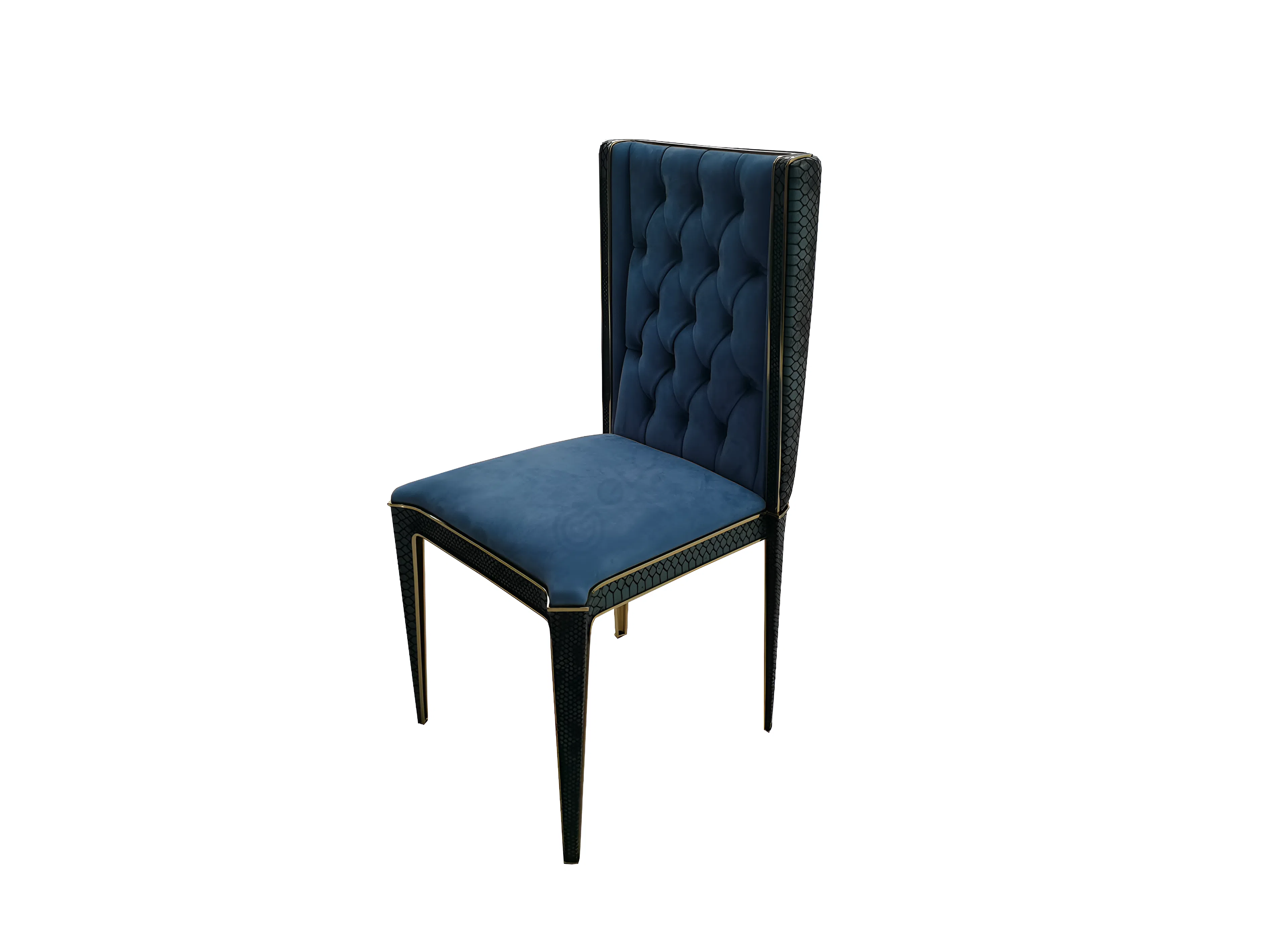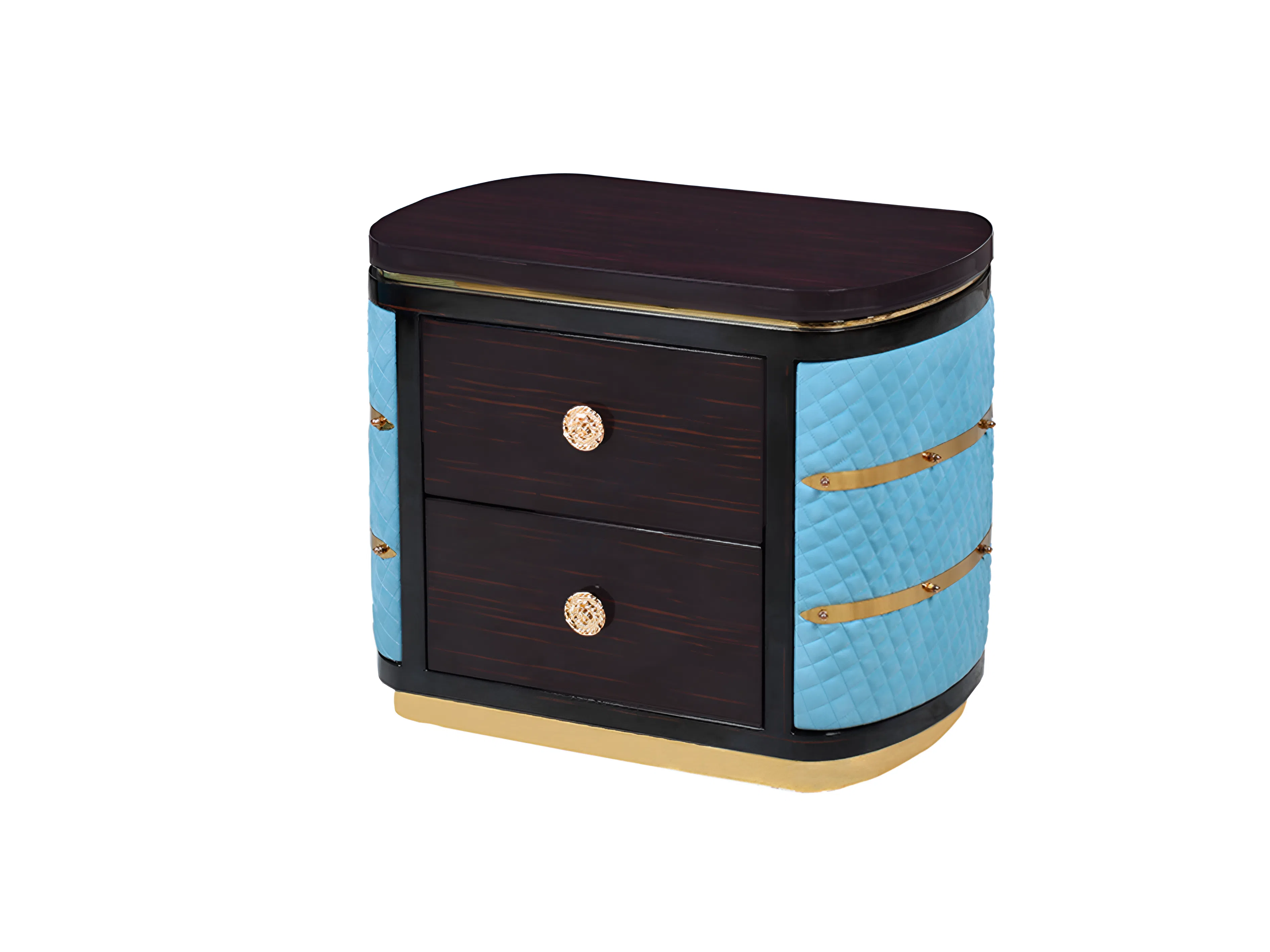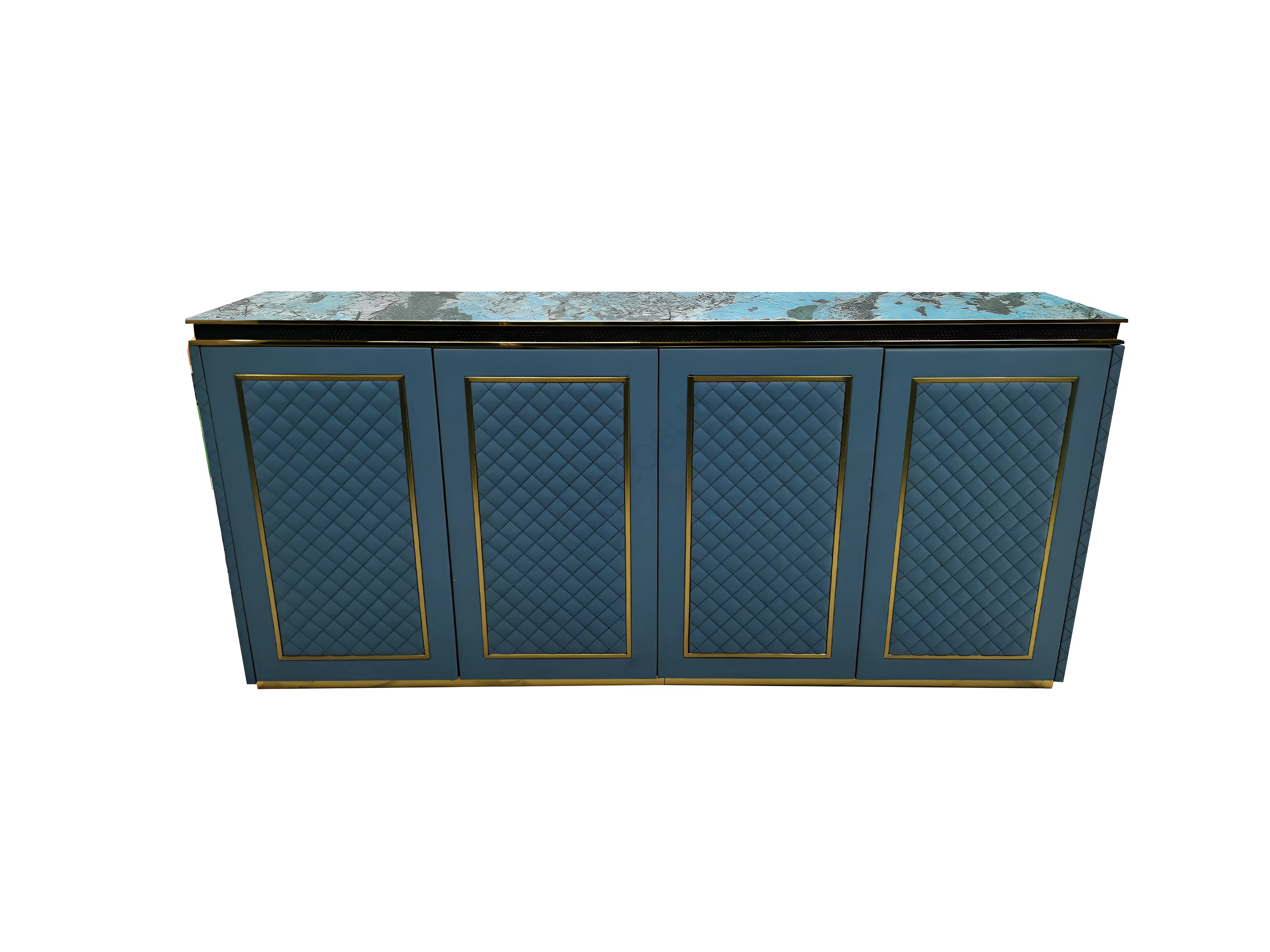 This modern cabinet features a distinctive blue finish that brings a fresh yet sophisticated presence to an interior space. The exterior is upholstered in a combination of Napa leather and PU, showcasing a quilted diamond pattern on the lower doors and side panels. This textured surface is complemented by gold-toned stainless steel trim that frames each section, providing a clean, metallic contrast to the soft upholstery.