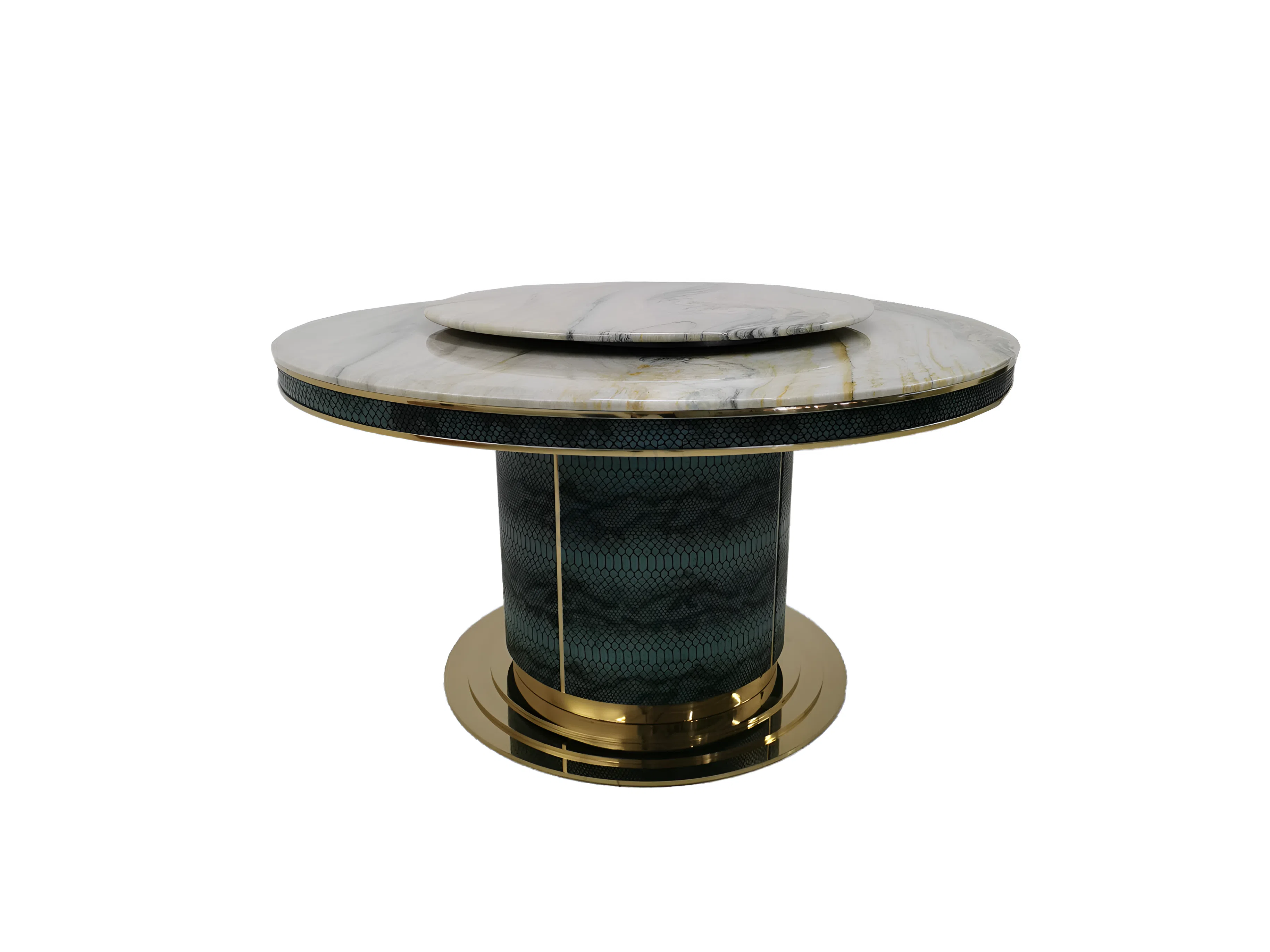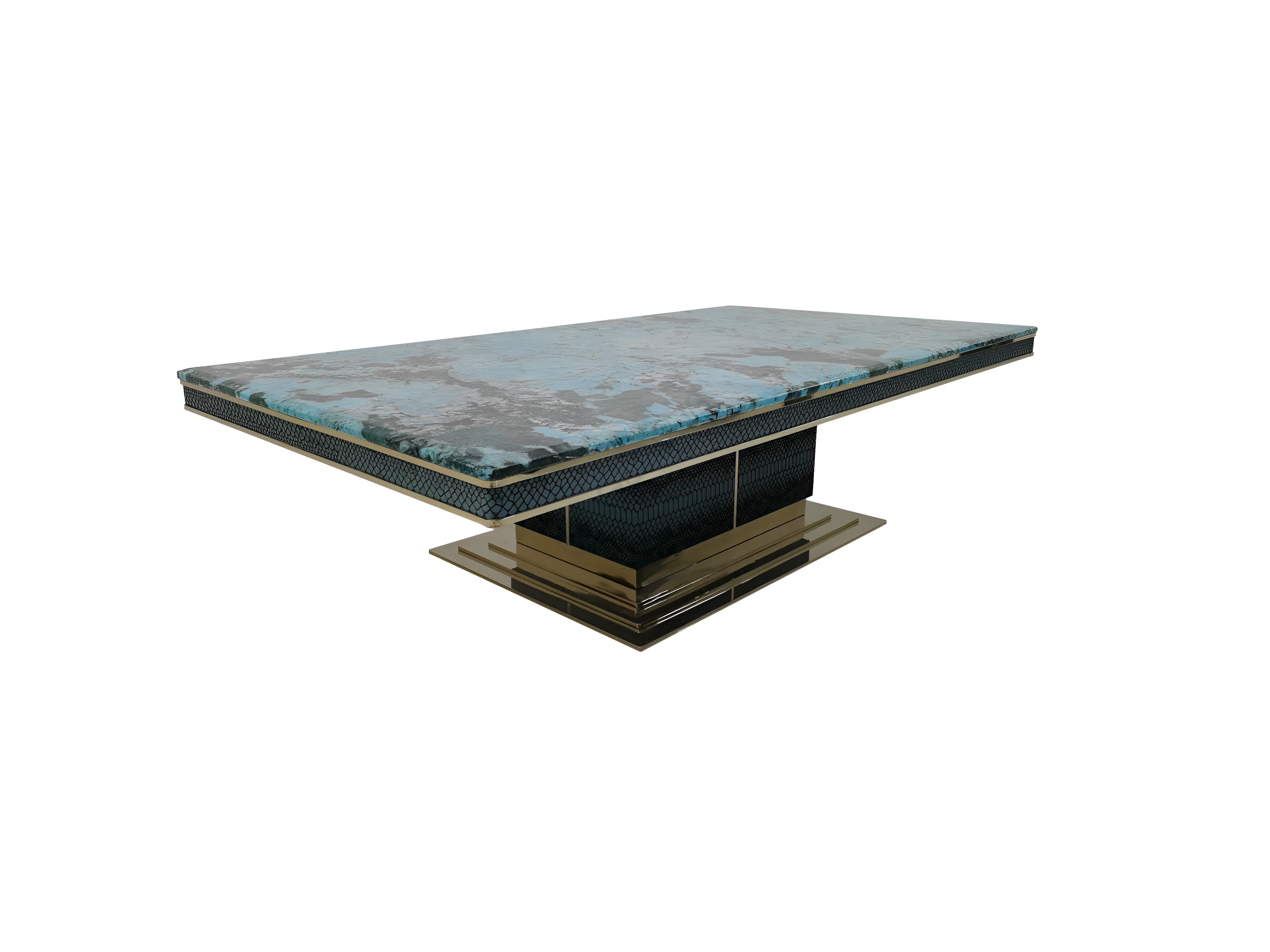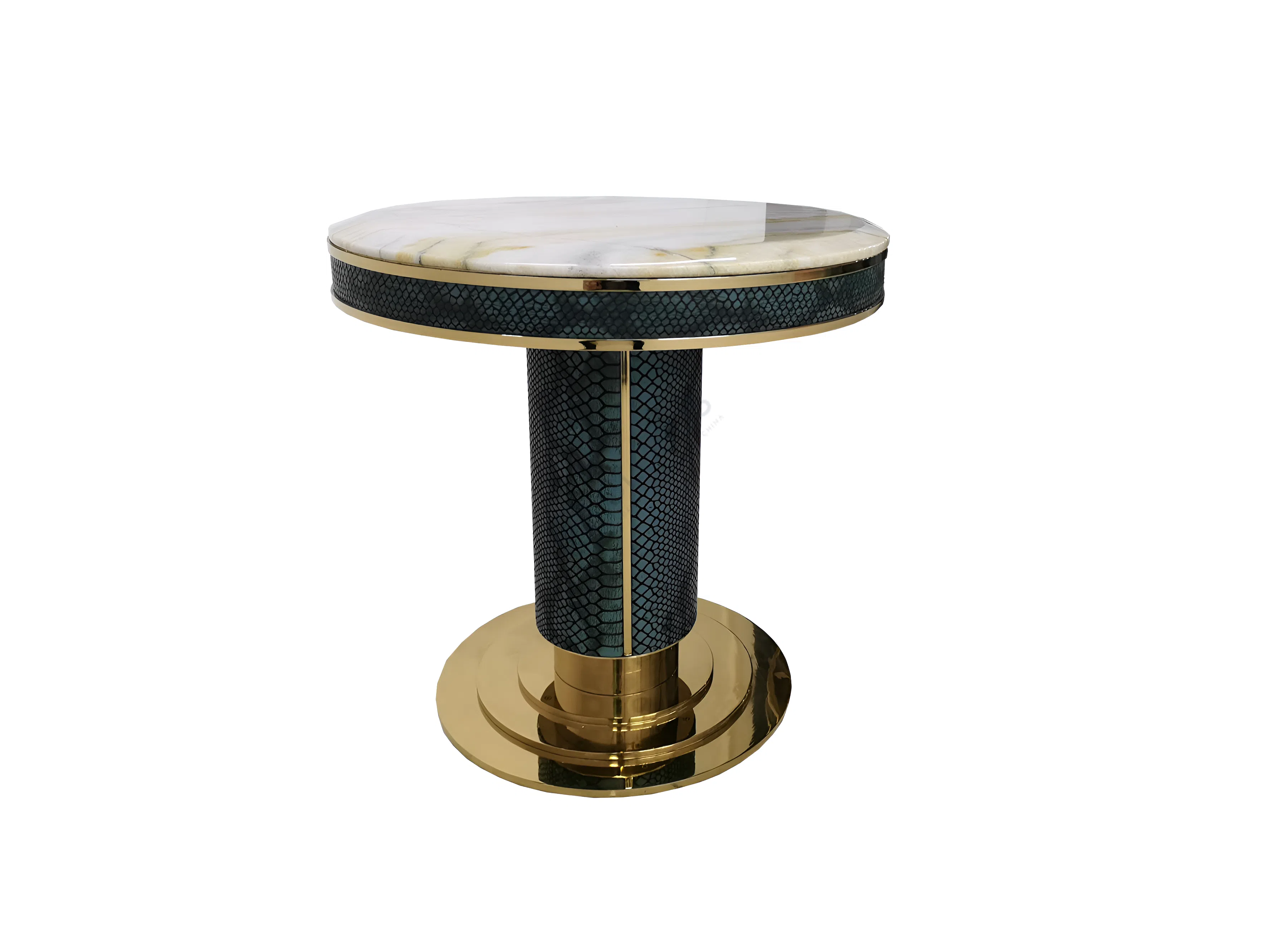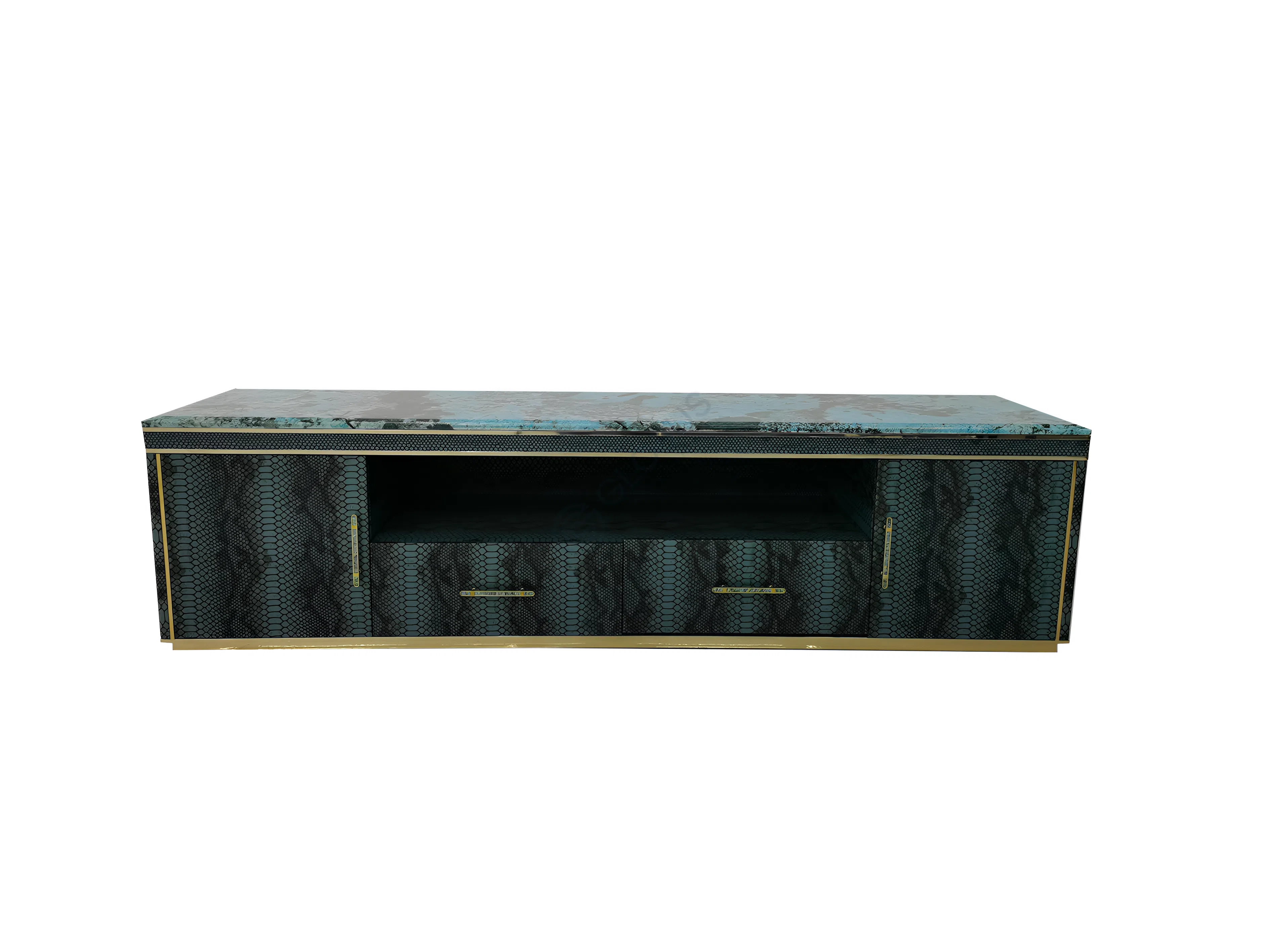This modern cabinet features a distinctive blue finish that brings a fresh yet sophisticated presence to an interior space. The exterior is upholstered in a combination of Napa leather and PU, showcasing a quilted diamond pattern on the lower doors and side panels. This textured surface is complemented by gold-toned stainless steel trim that frames each section, providing a clean, metallic contrast to the soft upholstery.