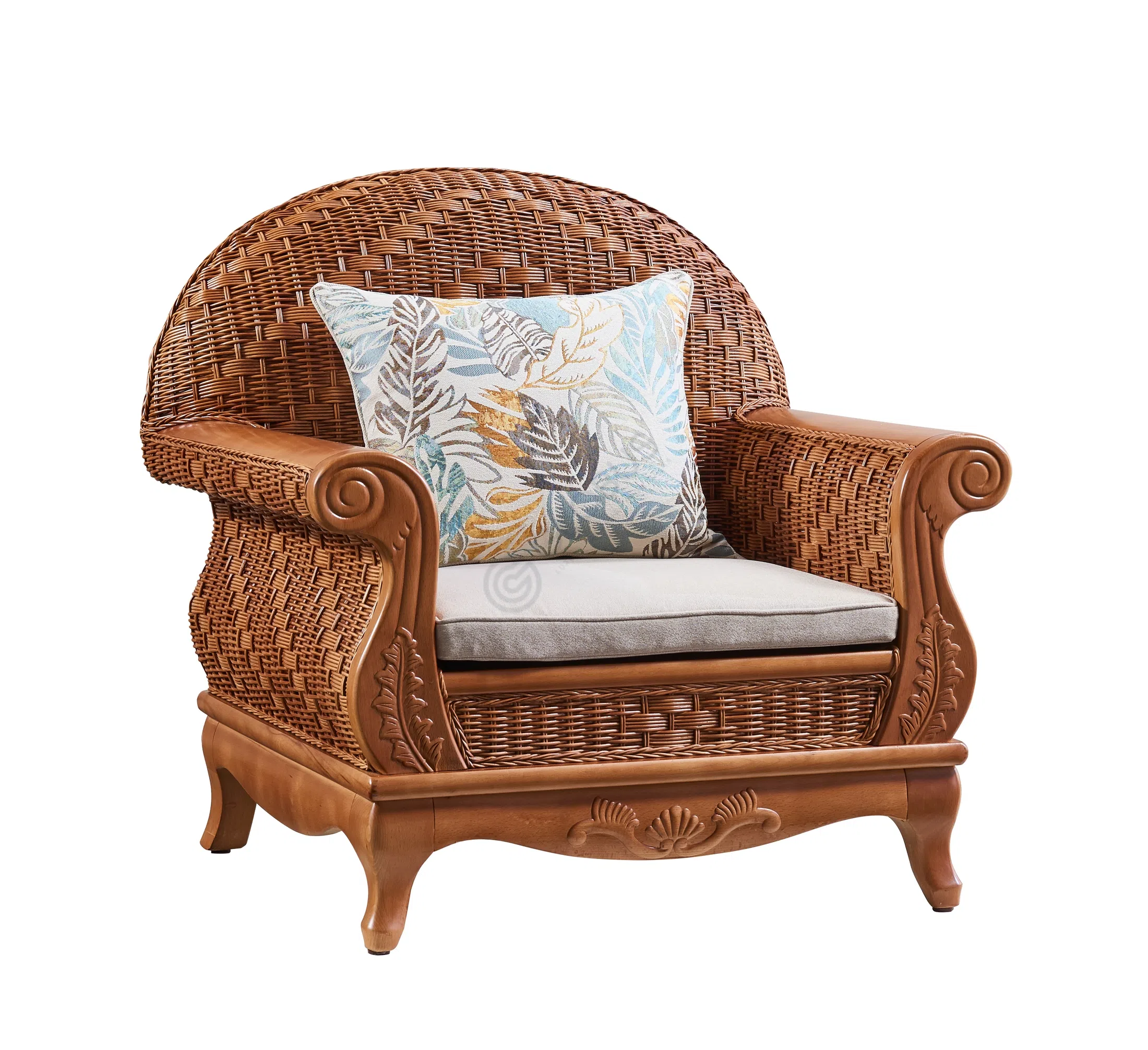 This sofa combines the warmth of natural materials with the refined silhouette of European classic design. Crafted from solid wood and intricate natural rattan, it serves as a sophisticated centerpiece for a living room. The frame features a rich, warm finish that highlights the detailed carvings along the base and armrests, adding a sense of traditional craftsmanship to the overall structure.