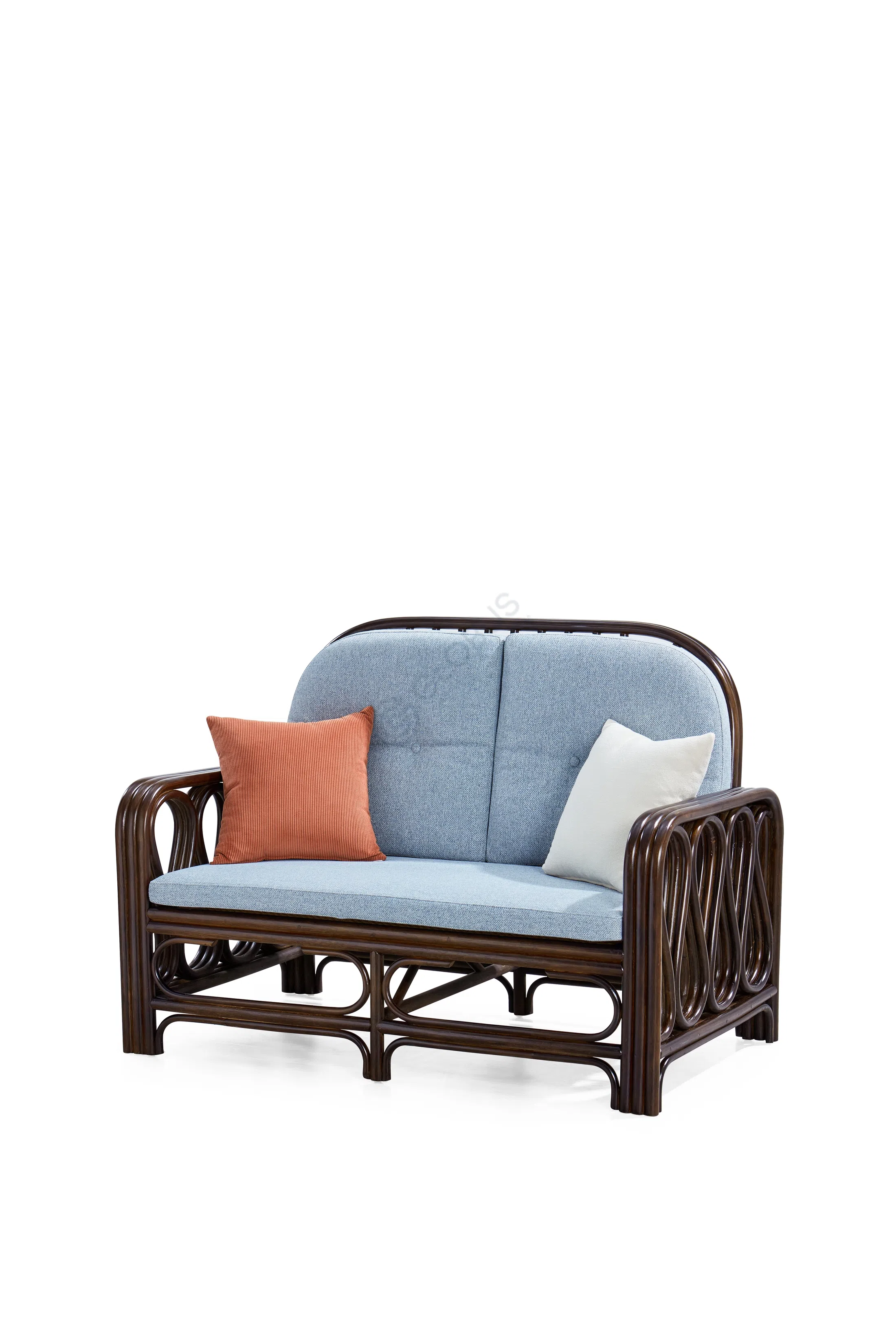 The cushioning is upholstered in a soft, textured textile in a muted sky-blue tone. A rounded backrest and a flat seat cushion provide comfort, while a small accent pillow in a warm terracotta hue adds a subtle visual contrast. The combination of cool and warm tones makes the piece adaptable to various color palettes within a contemporary interior.
