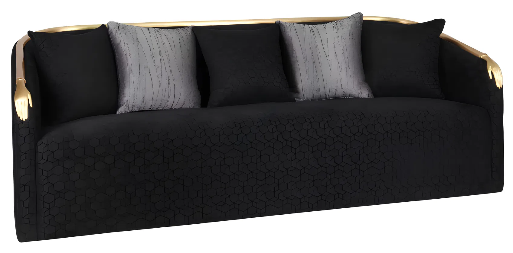 A defining feature is the polished copper rail that traces the upper perimeter of the backrest. This metallic trim flows seamlessly into uniquely sculpted hand-shaped accents that rest at the end of each arm. These artistic details provide a touch of character and elevate the piece beyond a standard seating option, reflecting a modern interpretation of early 20th-century glamour.