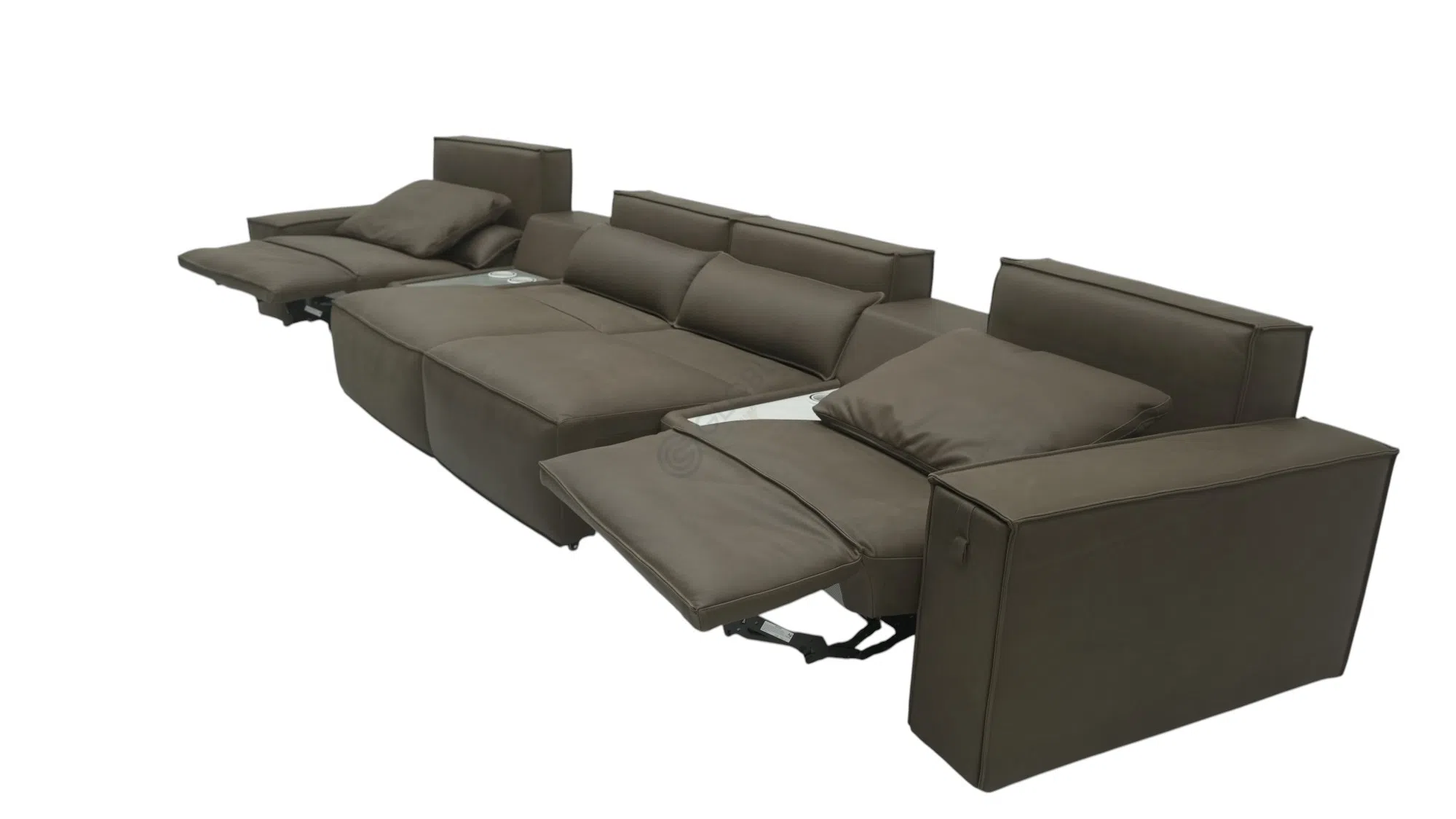 This modern sofa bed features a low, streamlined silhouette with wide track arms and clean panel detailing for a calm, contemporary look. The soft textile upholstery in a muted tone pairs easily with both light and dark interiors, making it a natural fit for a living room or a bedroom.