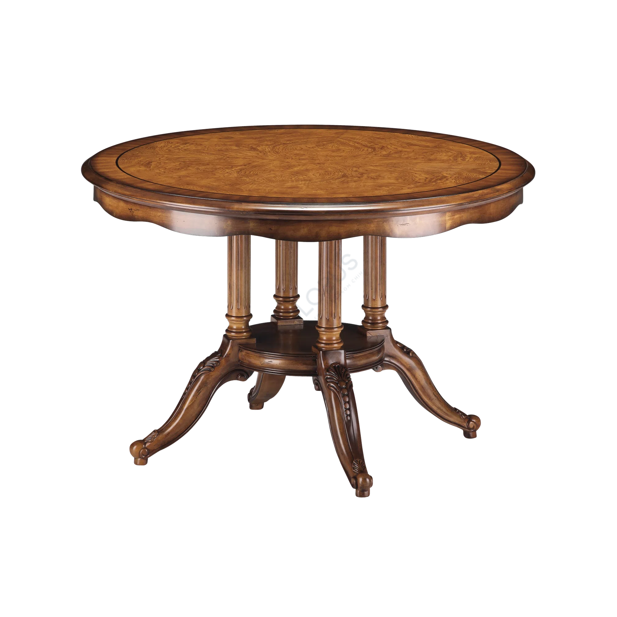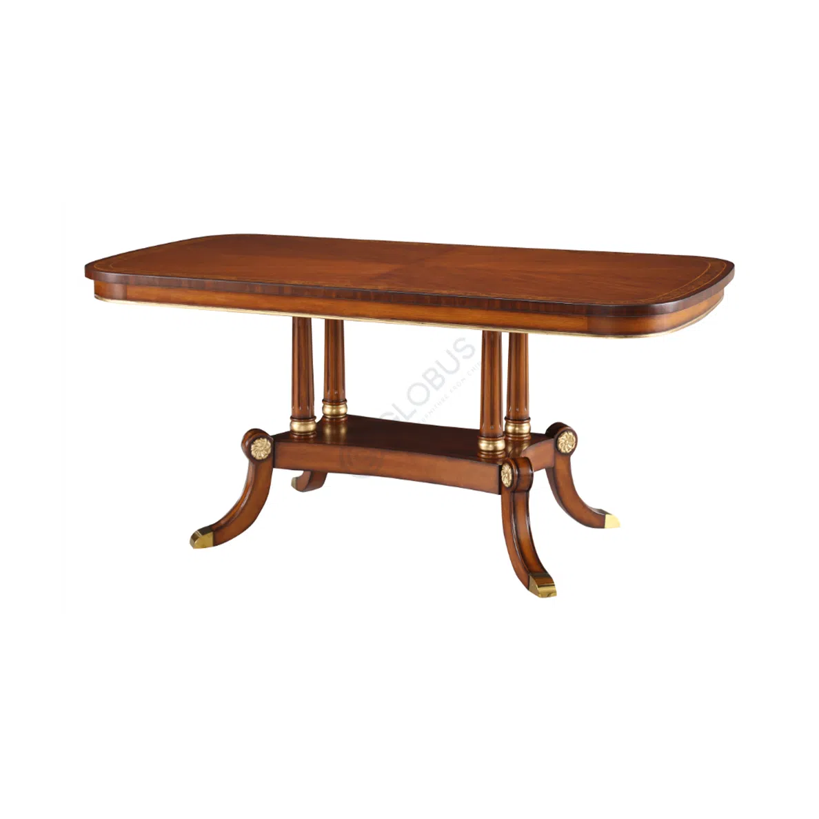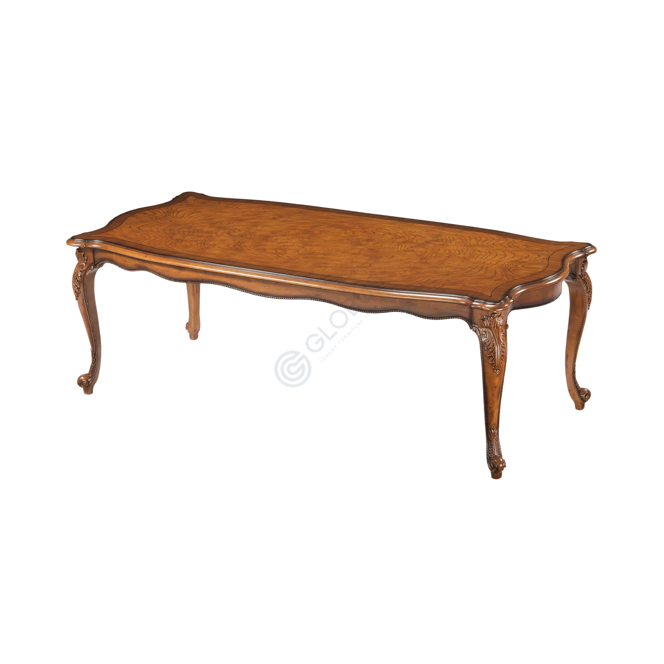 Classic and Traditional Grandeur: This is arguably the most natural pairing for royal luxury dining room tables. In a classic or traditional interior, these tables become the quintessential centerpiece. Think rich mahogany or cherry finishes, intricate hand-carved details on the legs or apron, and expansive, polished surfaces. They perfectly complement baroque and rococo. Tables with highly ornate carvings, gold leaf accents, and sweeping curves will echo the opulence of these historical styles. Pair them with upholstered chairs featuring cabriole legs and brocade or velvet fabrics. Sturdy, dark wood tables with elegant turnings or fluted legs fit beautifully into Victorian and Georgian styles. Surrounding them with high-backed upholstered chairs, perhaps in deep jewel tones, will complete the look. While often lighter in feel, a royal luxury table with a distressed finish or subtle ornamentation can still ground French Provincial style, especially when paired with elegant fauteuils. In these settings, the table reinforces a sense of history, refinement, and enduring family heritage, often surrounded by antique sideboards, classic chandeliers, and framed artwork.
